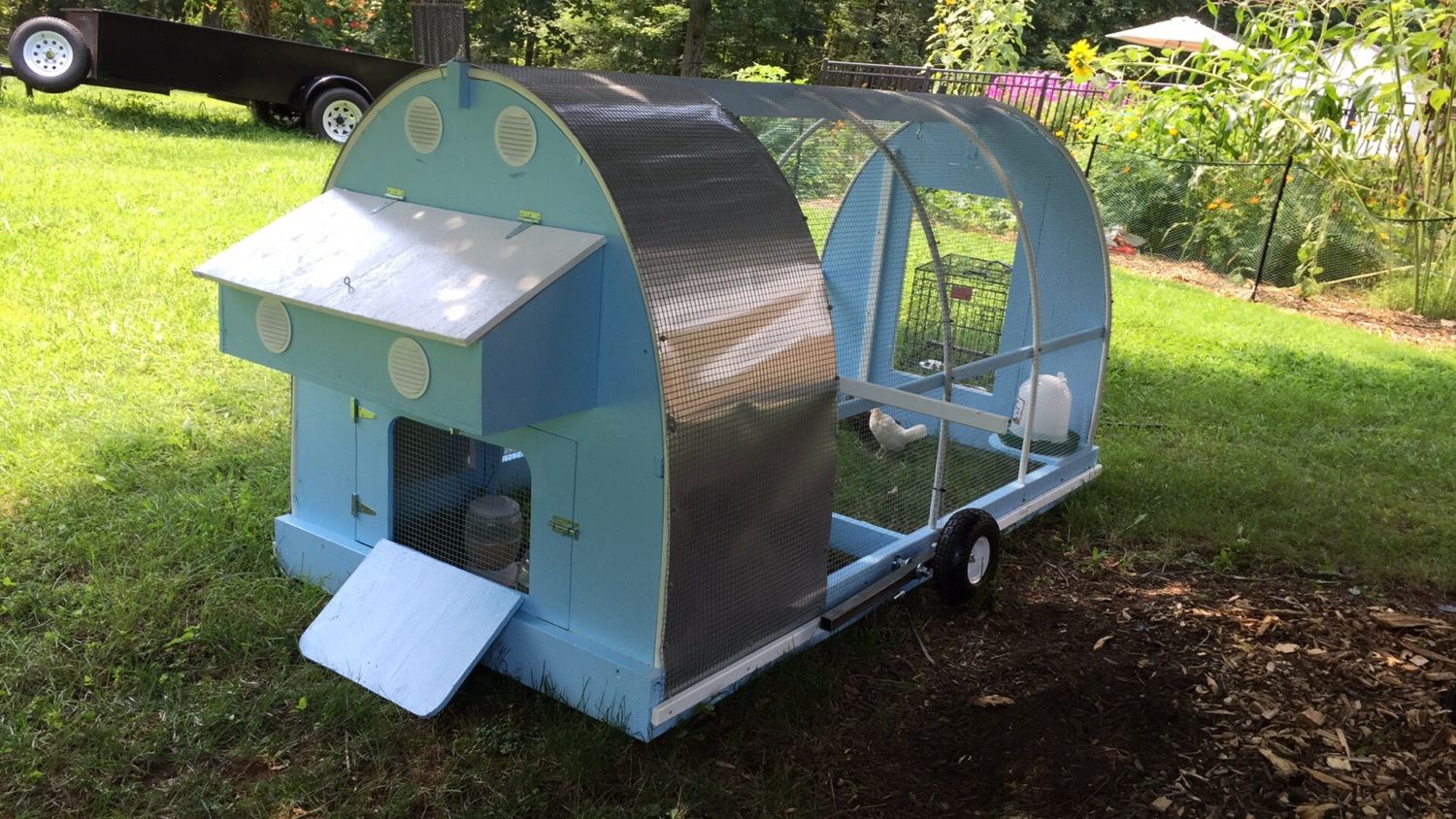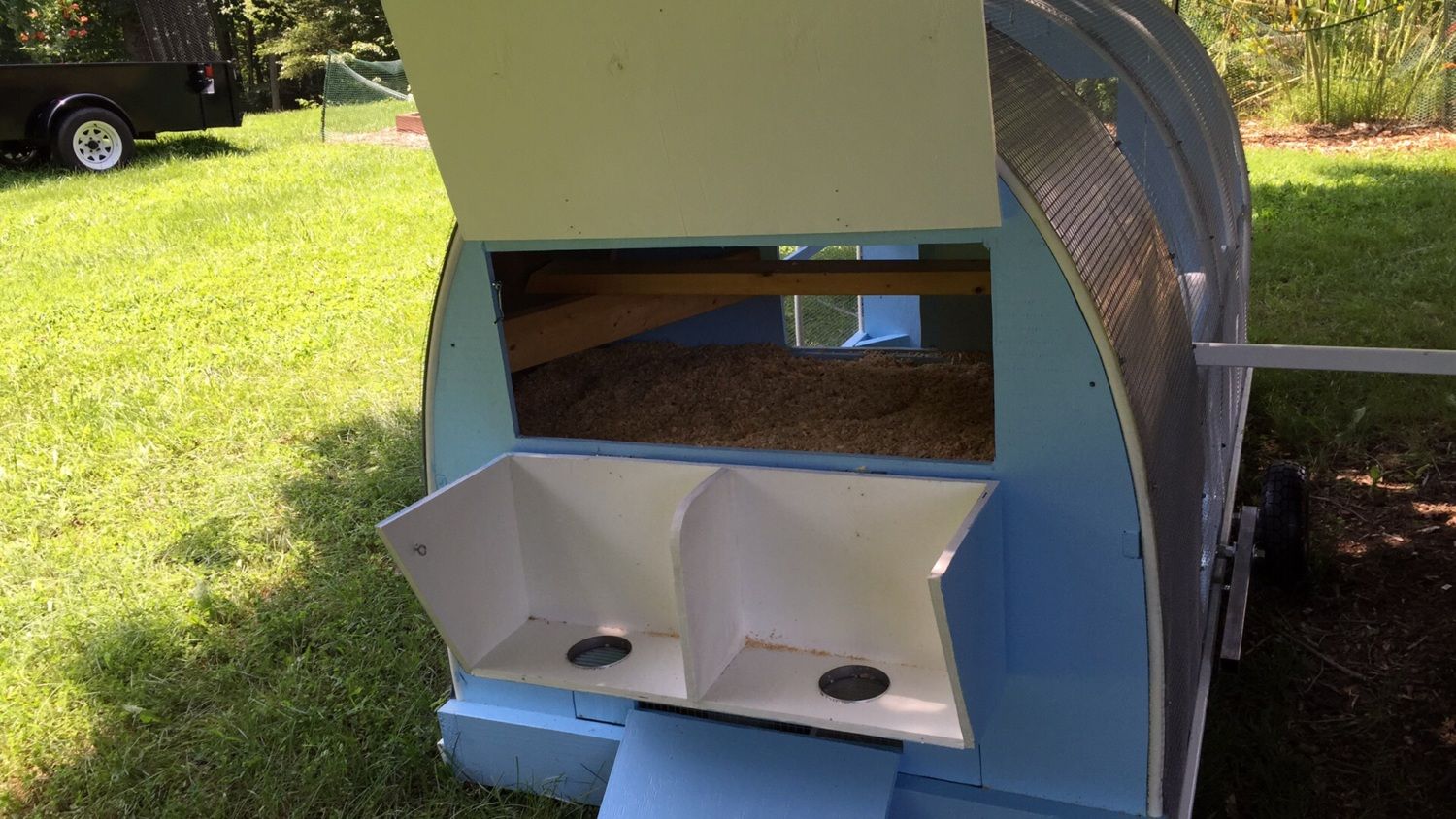 This is one of the nests I built. I used all scrap lumber, so it didn't really cost me anything. It is a 10 hole nest, which is way more than they need in the small pen this is in. I don't think they ever used more than 3 of the nests. When I get time, perhaps this winter, I'm going to convert it to a roll out nest.