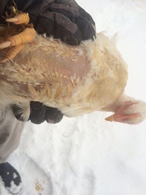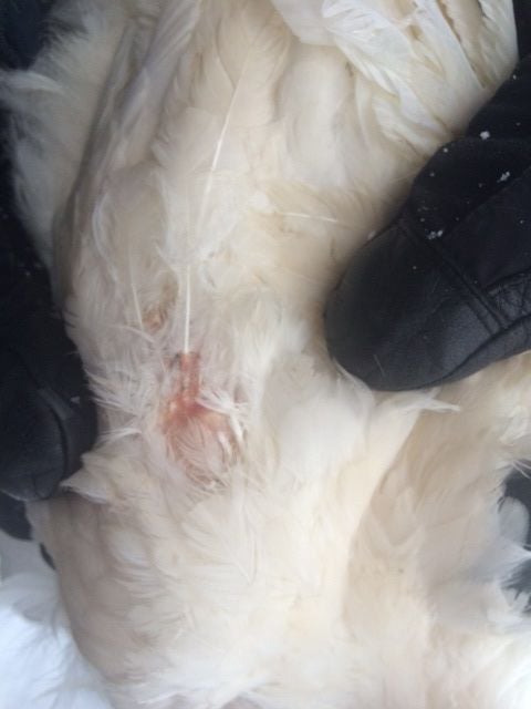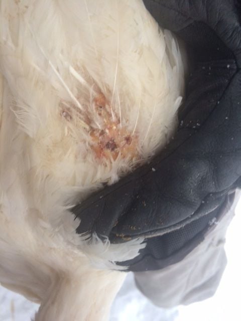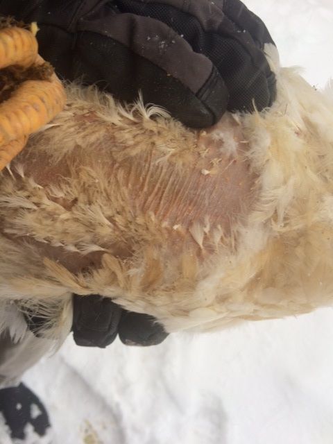 One of the birds looks pretty...raggedy, for lack of a better word. She looks sick. The belly skin is exposed and red, and she's developing these scabs on her wings. None of the other birds (15 others) have these symptoms. She's still very active. Eats normal, but is excessively thirsty. Every time we look at her, she's drinking.