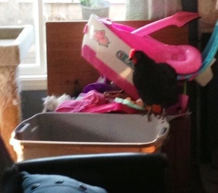 I thought that if she was well enough to fly out of a deep bucket to roost on the edge, then she was well enough to go back to the coop, so I put her out, but she was immediately attacked (my, the pecking order is a fickle thing!) and it was cold. She started wheezing with the exertion, so I brought her inside again and put a baby gate over the top of the bucket.