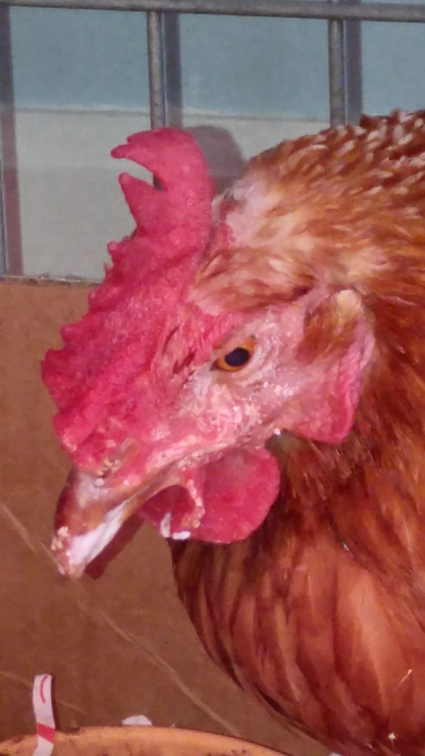 One of my chickens, who is about 2 years old, has become sick. She has been sick for 7 days now and seemed to start getting better (day 2-3), but now had started going downhill again (day 5-7). I have been doing research based on her symptoms to come to a diagnosis to treat her properly, but have been unsuccessful. She is lethargic and doesn't move much but will stand up. Her tail feathers are tilted down and her wings are dropping. The area on her face around her eyes and beak looks shriveled and scaly. This symptom started within the past 2 days. The second day of being sick her comb was purplish-blue at the edges and shriveled, but this went away within a day after I brought her inside. Her poop is abnormal in that the white part is very loose and there's a cylindrical, relatively solid piece that is brownish-green. She's been eating and drinking some whenever I dip her beak in the water. I have started treating (2 days) Corid for Cocci, but have not seen an improvement yet. I have not seen any blood in her stools, so I'm not sure she has Cocci. I have been giving her greek yogurt and soaking a few pieces of her regular food in it and she will eat a little bit at a time. She's lost weight over the past week from not eating much and feels very light. I've been giving her vitamins in her water as well. I have 5 other chickens which aren't showing any signs of sickness. I would really appreciate any suggests or help with diagnosing her and figuring out a treatment.