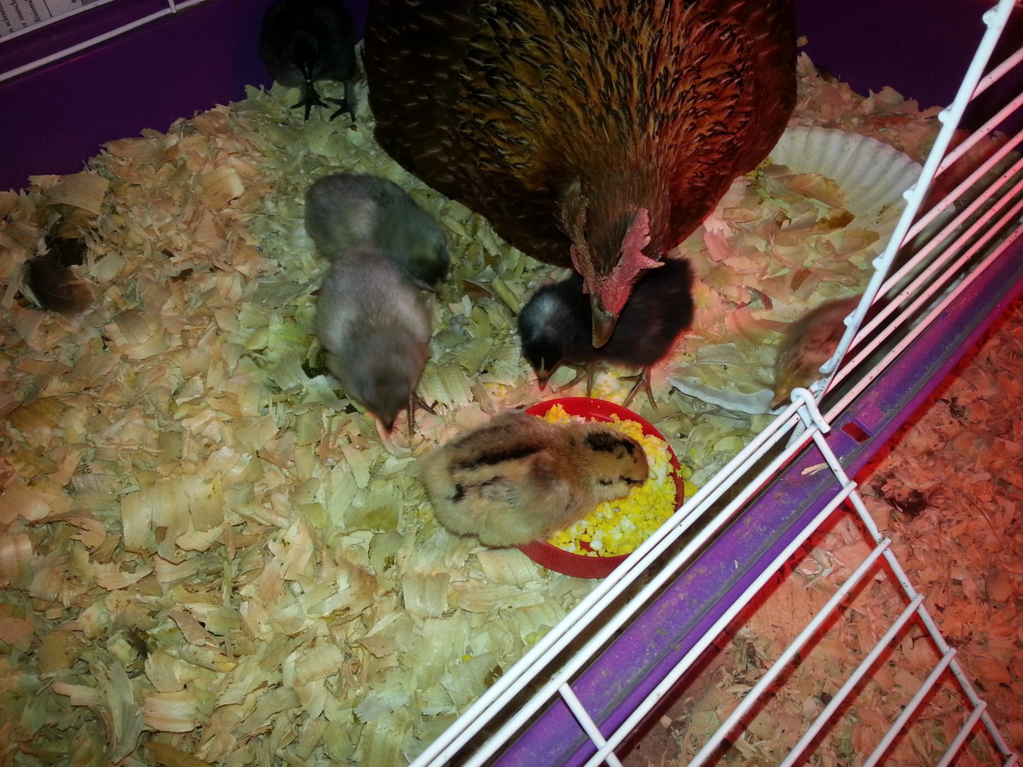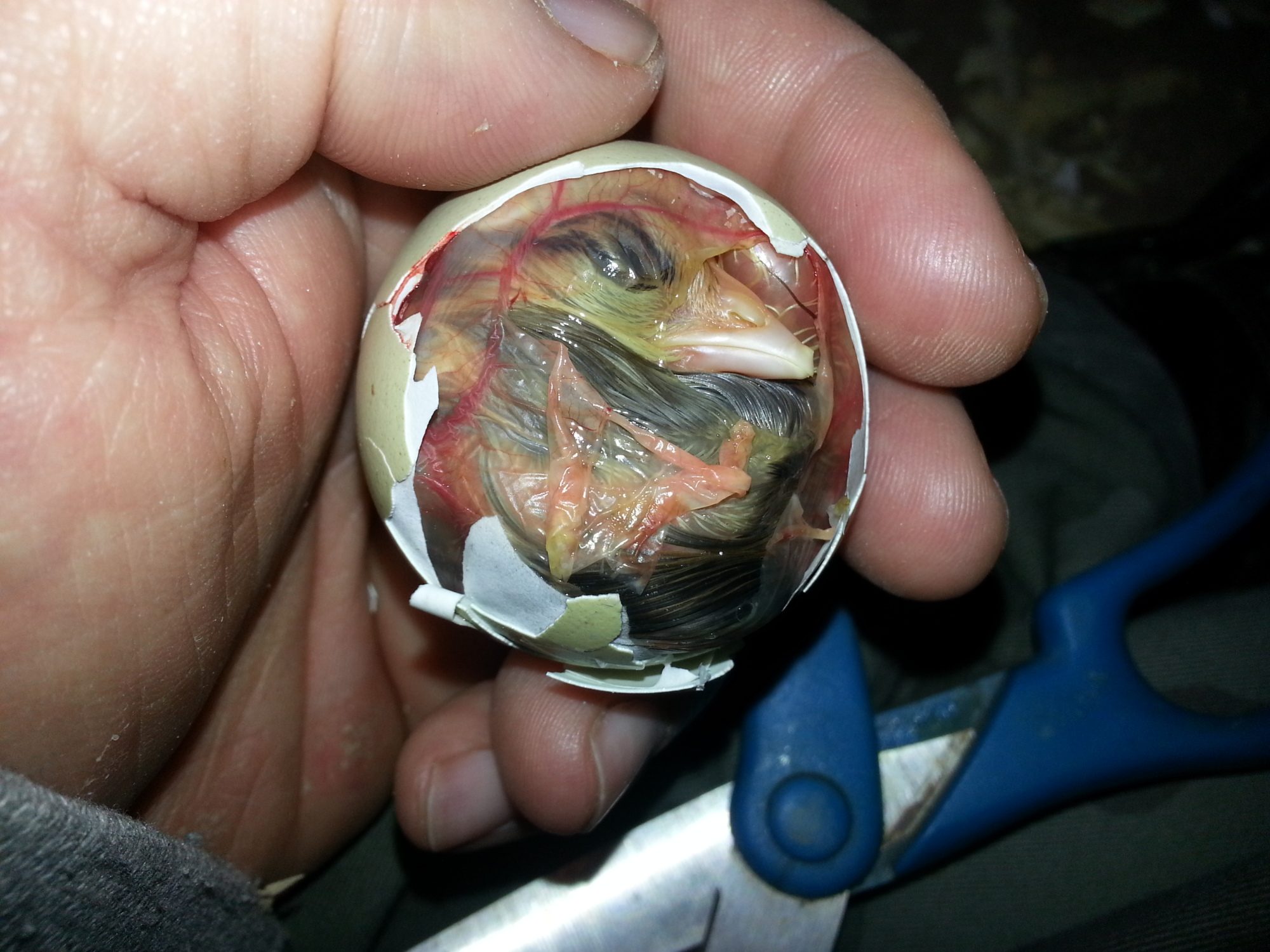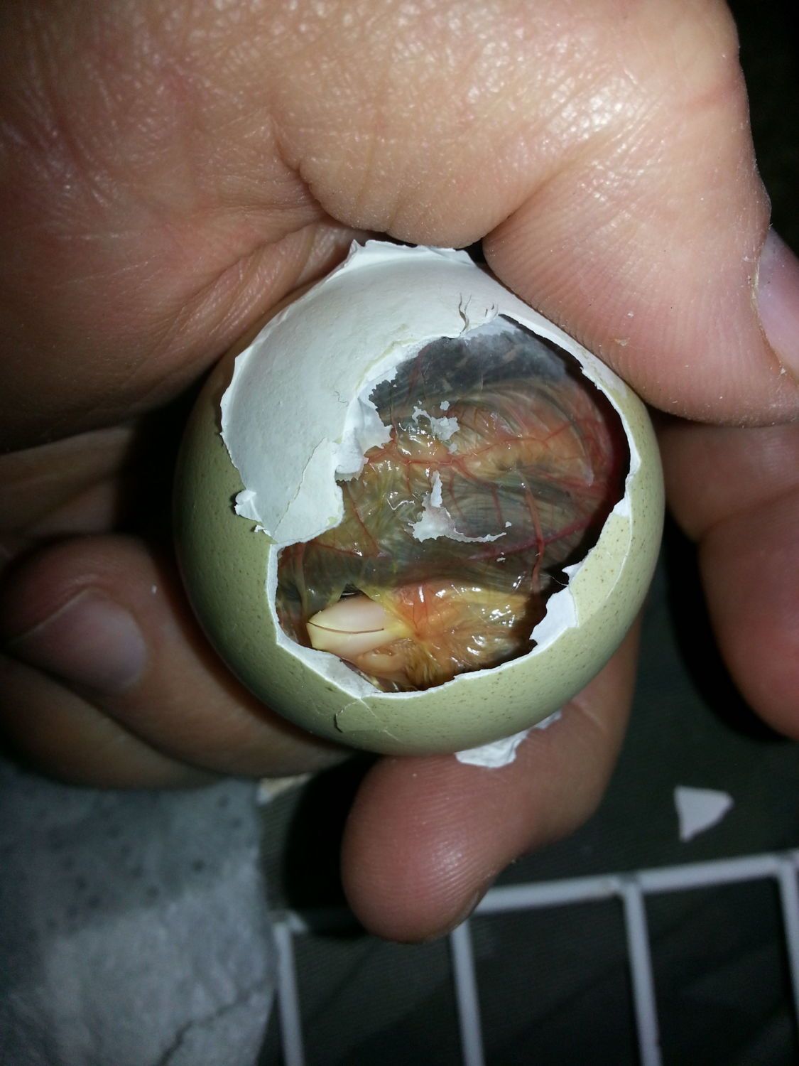 If we have to moisten the membrane and still waiting, we will check it again and break more shell. It is true that it may be a weaker chic, but at this point it is dead anyway so why not give it a chance. If you must help it out, chip away the small end careful not to cut into the membrane. The membrane is full of large veins. Cutting a vein will cause the chic to bleed out. After removing entire small half of the egg shell, continue to moisten the membrane. At this point, you can keep an eye on it. Momma hen will have a responsibility to do her thing. If you feel the need to finish the hatching, slowly and carefully cut the membrane avoiding the veins. We generally do this to ensure it will make it out. After removing half the shell and cutting through the membrane, we then remove shell from the bottom half. only about another forth is all that is necessary. By this point, Momma hen will peck at it and get it moving around so it can finish it's journey.
