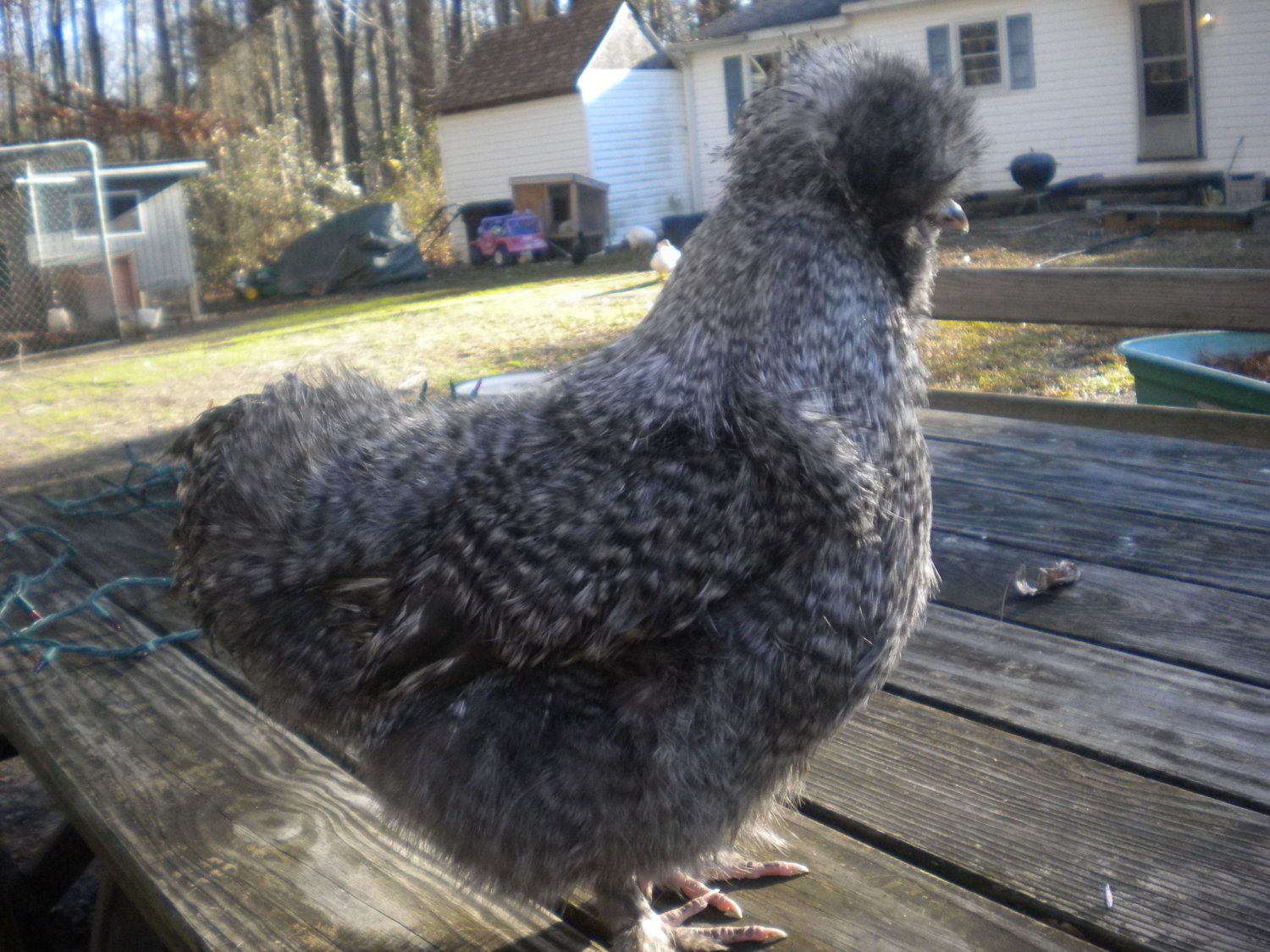 (She's 4 1/2 months old) She has dark eyes (no pigment holes) all of her exposed skin is dark, her comb is small and dark, her feet are dark with five well separated toes, all have nails and are getting fluffier every day. Thanks a bunch for helping guys. I'm kind of barn blind when it comes to my animals, I think they are all gorgeous.