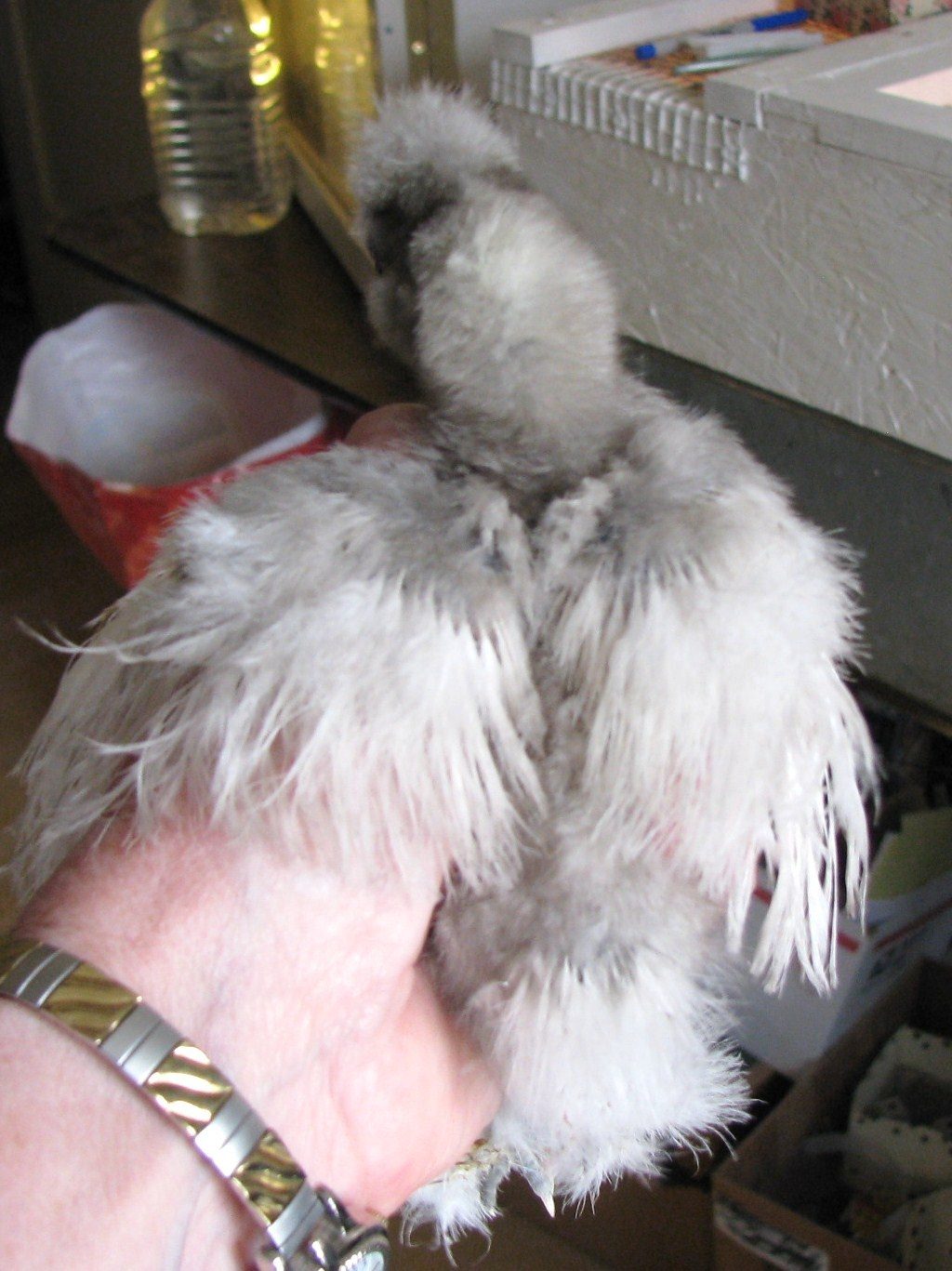 Peepblessed, I see why you were confused - that chick looks almost lavender in chick coloring but is coming in white. If you breed it back to its parent you will get more silver based whites (I believe its recessive white?).