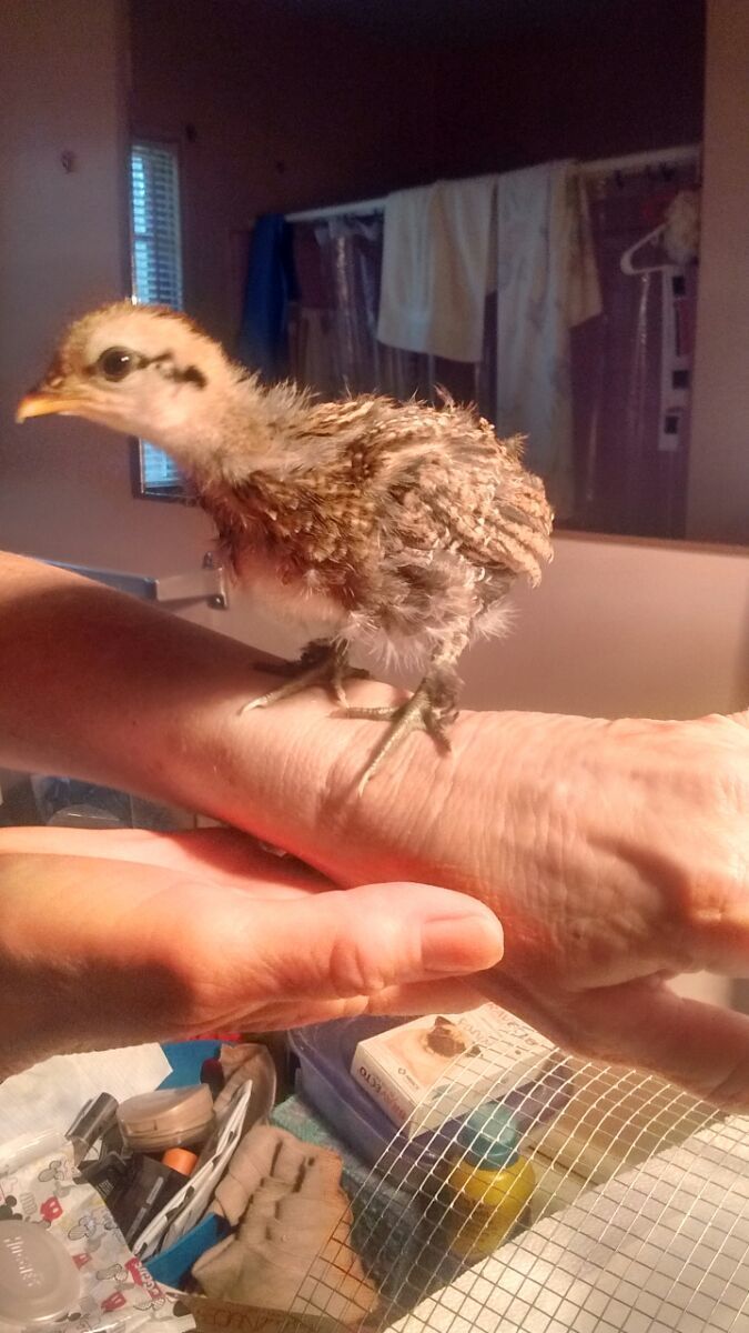 I have two painted silkies that I've had for about 2-3 months. The hen went broody and was on four eggs. Unfortunately, three were snatched and I brought the last remaining one in here to hatch in my incubator. It just wasn't safe outside. The baby hatched, and clearly is only part-silkie. I can't figure out who the father is. She was only in with the rooster, though I've had occasions where other chickens have managed to get in their section. I have a painted silkie rooster, a white silkie rooster, a blue-black cochin rooster, an Alsterier rooster, a black Swedish rooster and a D'Uccle rooster. I'm just not sure what the other part of this baby could be! The baby, whom I've named Tweeter, is a little over 2 weeks old now.