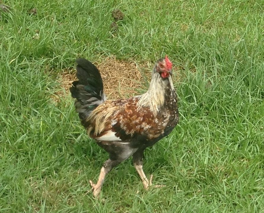 The huge rooster and on the right the head of my largest laying hen. She is a little further away but you can still see that the rooster is very large. And just look at the colour of those feathers