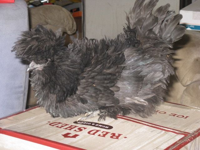 here she is she is a cross from my standard buff laced polish roo a blue sizzle hen (silkie/ bantam frizzle cochin cross) this is when she was a little younger she has more feathers now and the flash from the camera makes her a little lighter but she is VERY black and her feathers shine green and purple in the sun