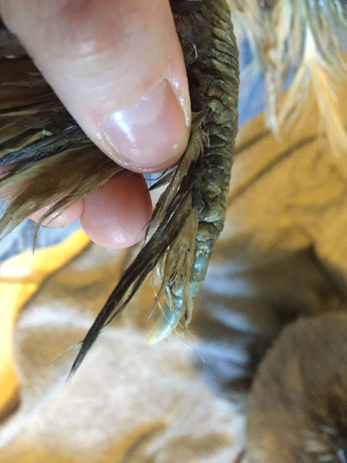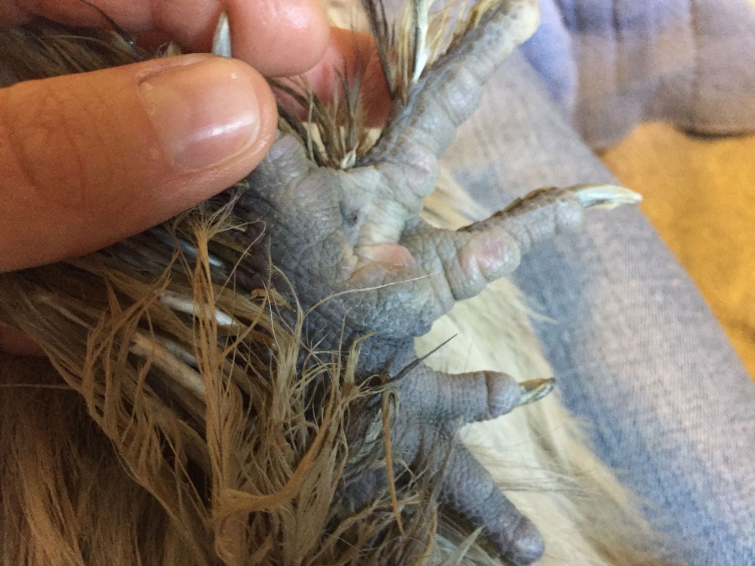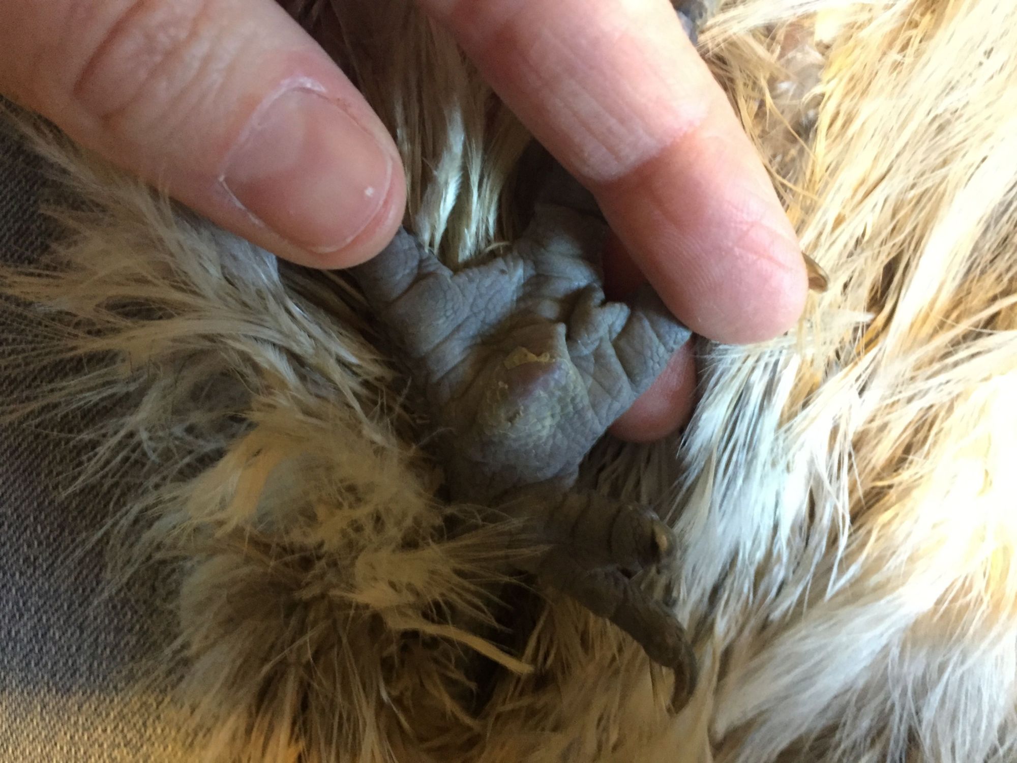 The hen has what appears to be some flaky skin hanging off the bottom of her feet. Not sure if her pad is swollen? I've been treating her the same as the rooster just in case, and this flaky skin thing just appeared this week. Ideas?