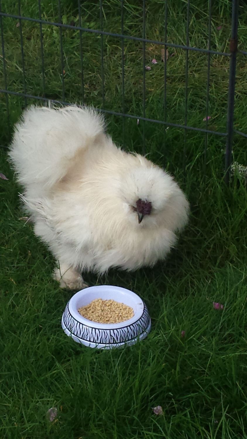 Silkies and children seem to go together but, you know that by now. The big combs and beards do obscure their vision. People think they tend to be slow witted. Trimming back the feathers so they can see makes a big jump in their IQ.