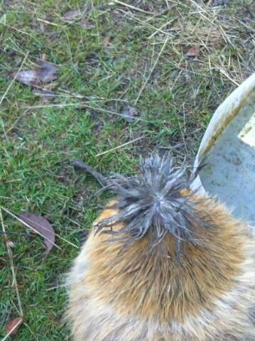 Now three and a half weeks on i went up to my chickens today and it seems that another has the same wet pom pom effect. She is pretty much camping herself next to the water bowl and is drinking frequently and wont roam too far. This particular hen has a gummed up eye. It looks like a feather has gotten caught in her eye (whilst still attached to her head) it has also gathered a bit of dirt. I will mention we have had a large amount of rain.