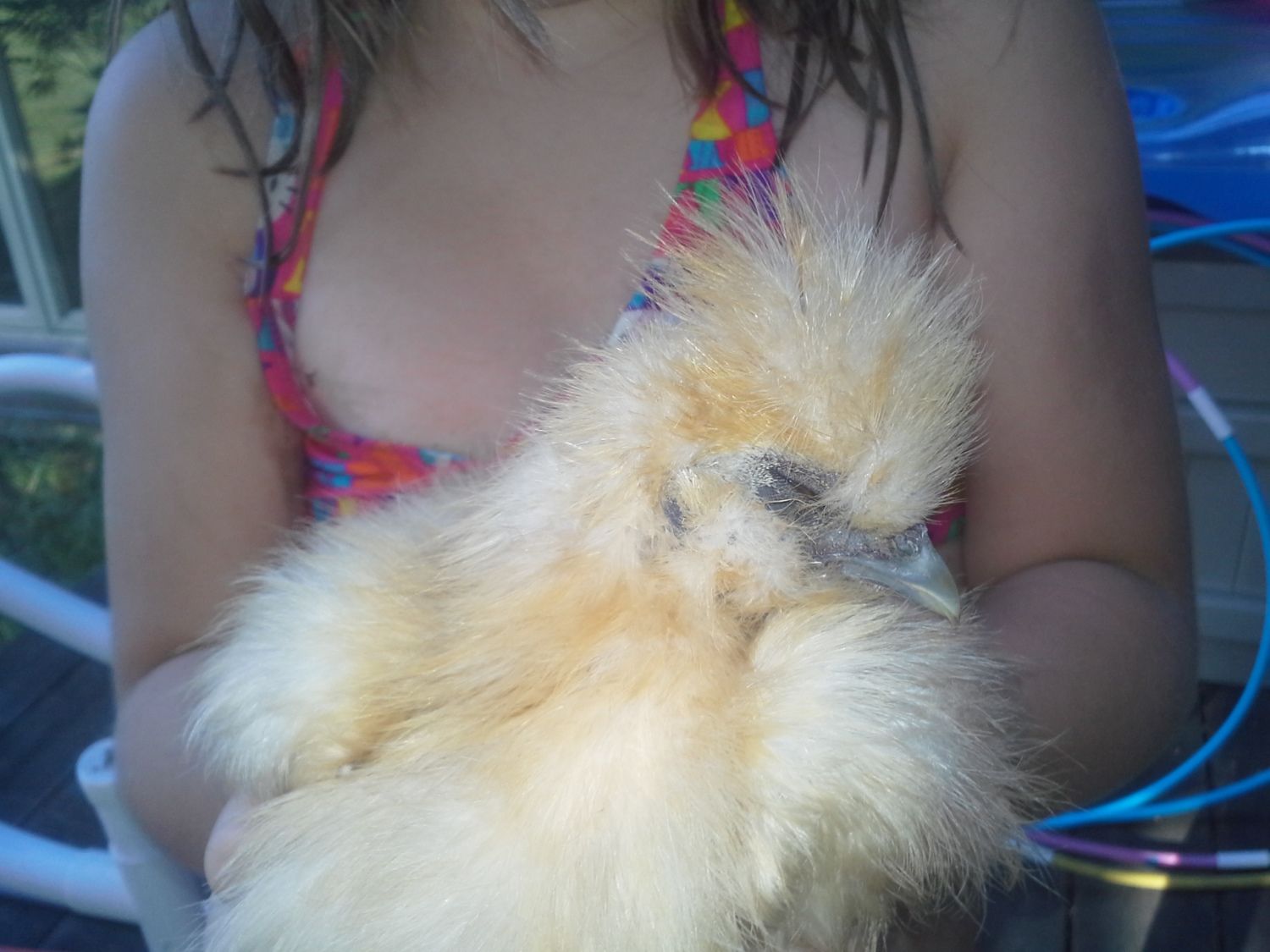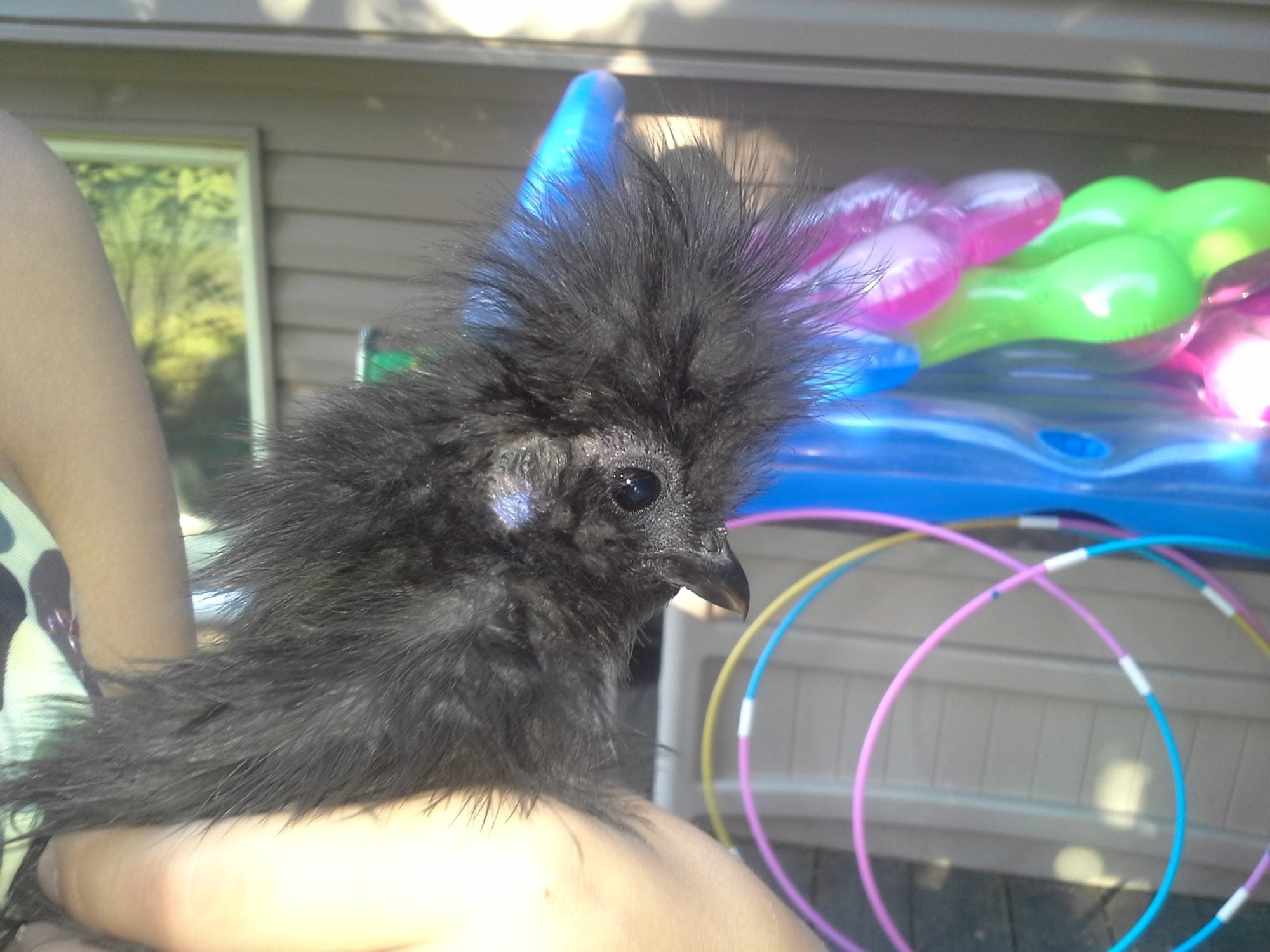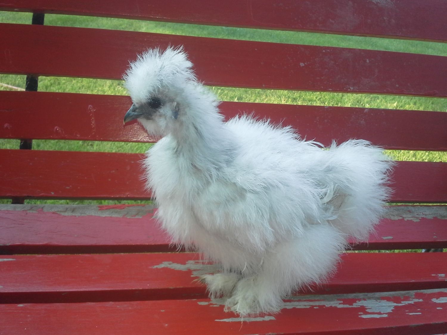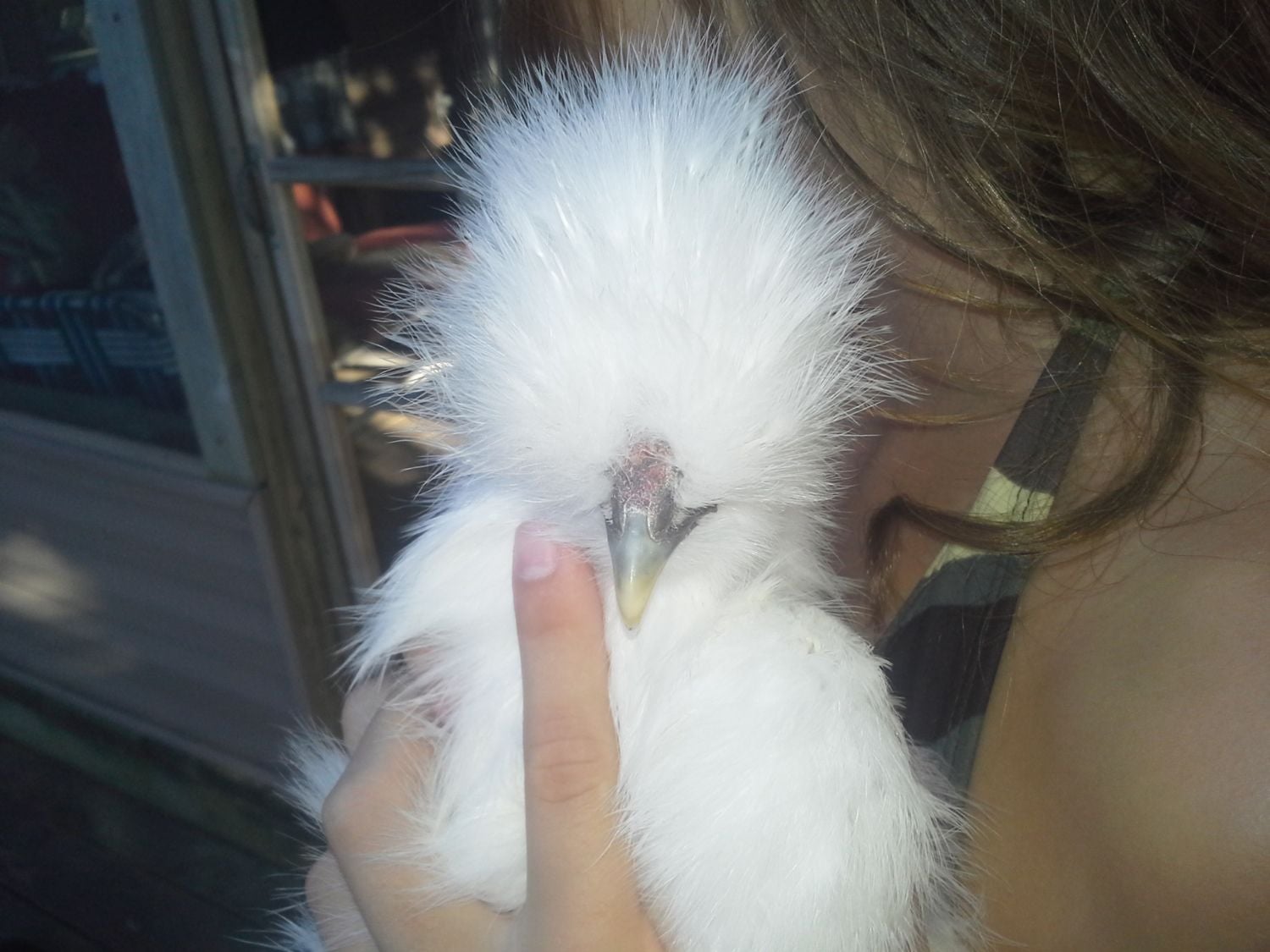 Pinto -- now I only have a few shots of Pinto because nobody wants to hold it to get comb and head shots. It has a real problem with clinging poop and I'll leave it at that. That's the reason it has no tail. As for a comb, its comb is very similar to Cottonball's -- not very big at all. Hopefully that'll help.