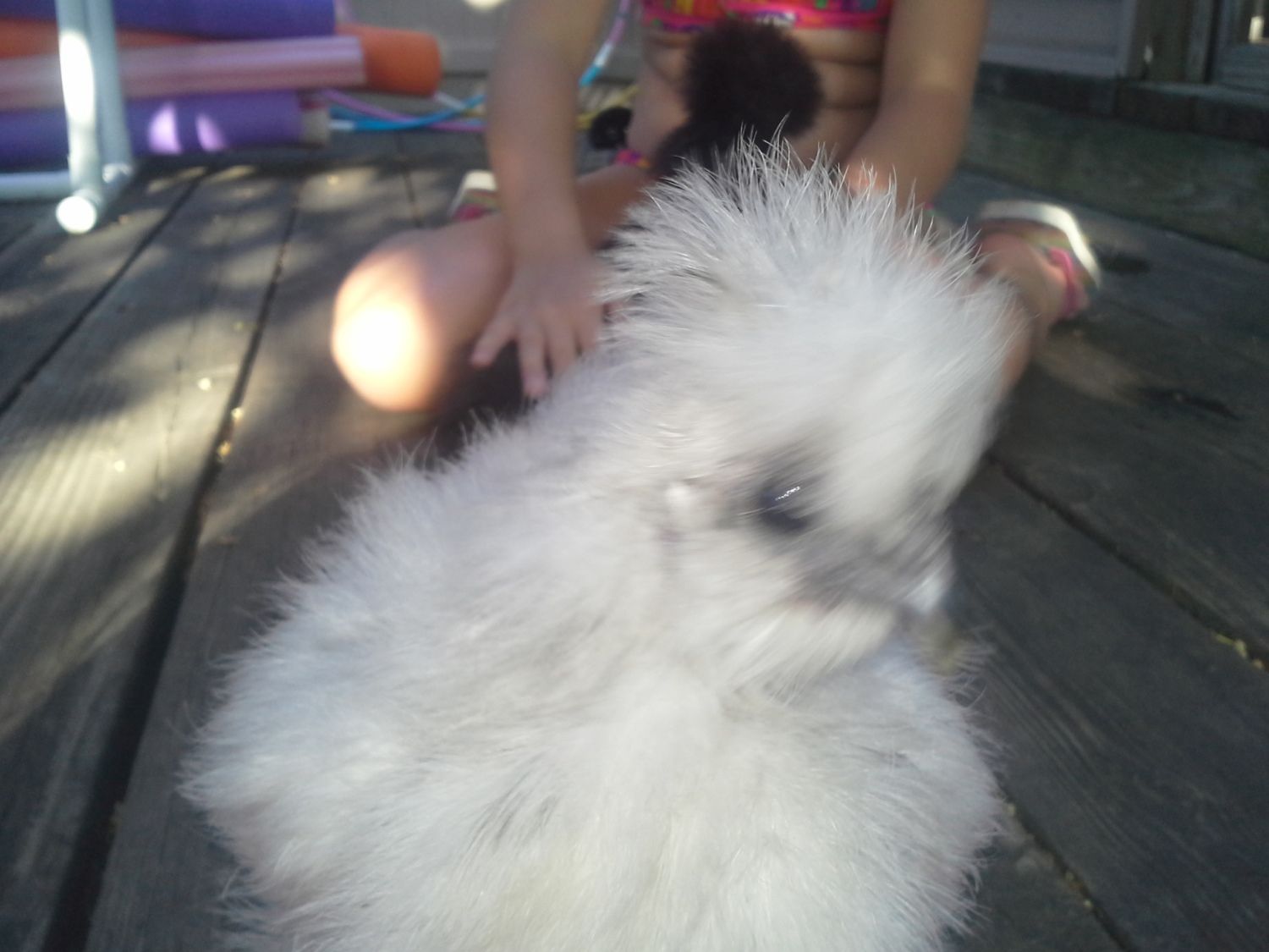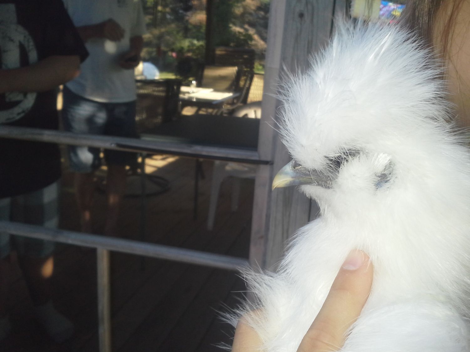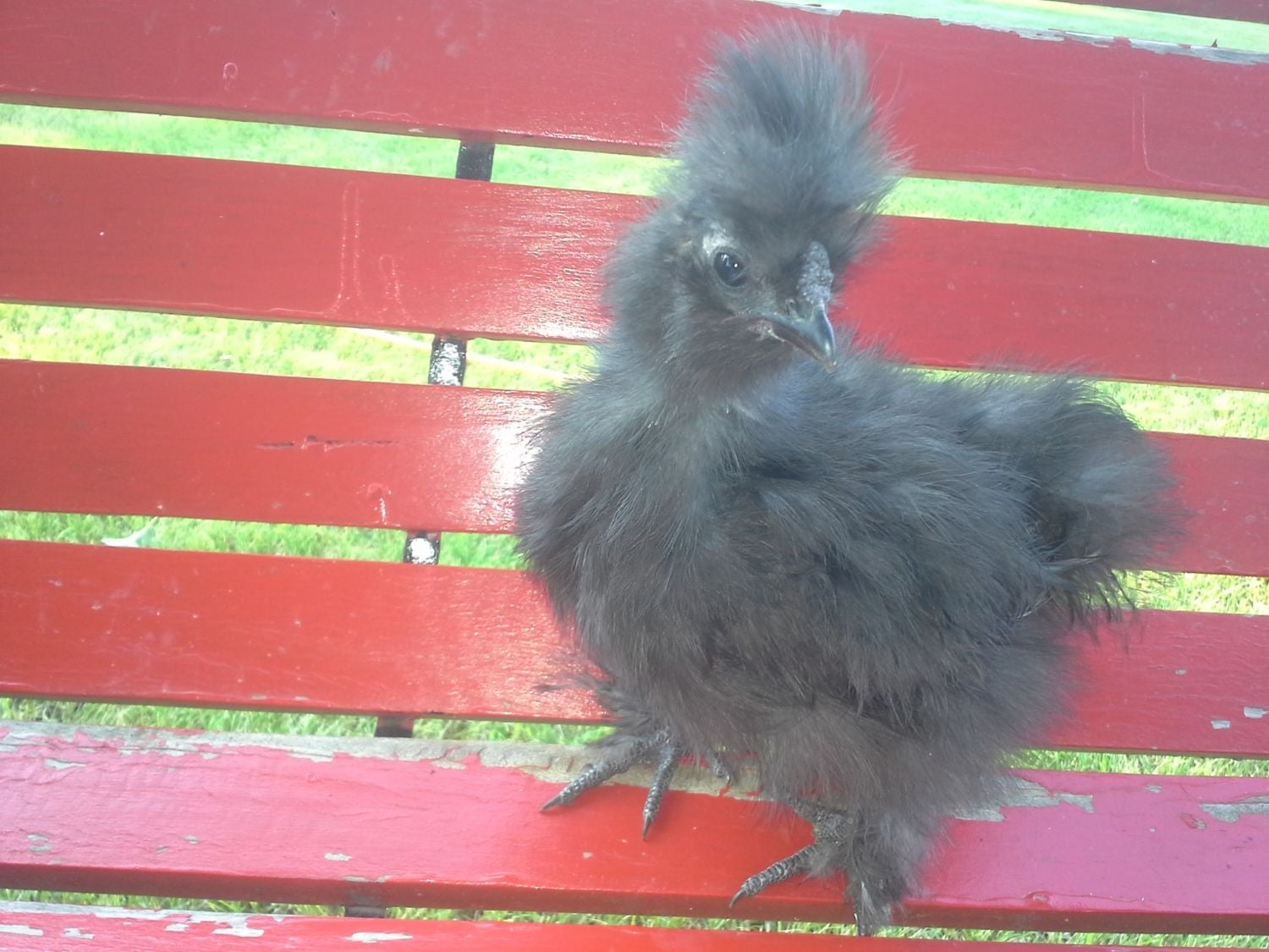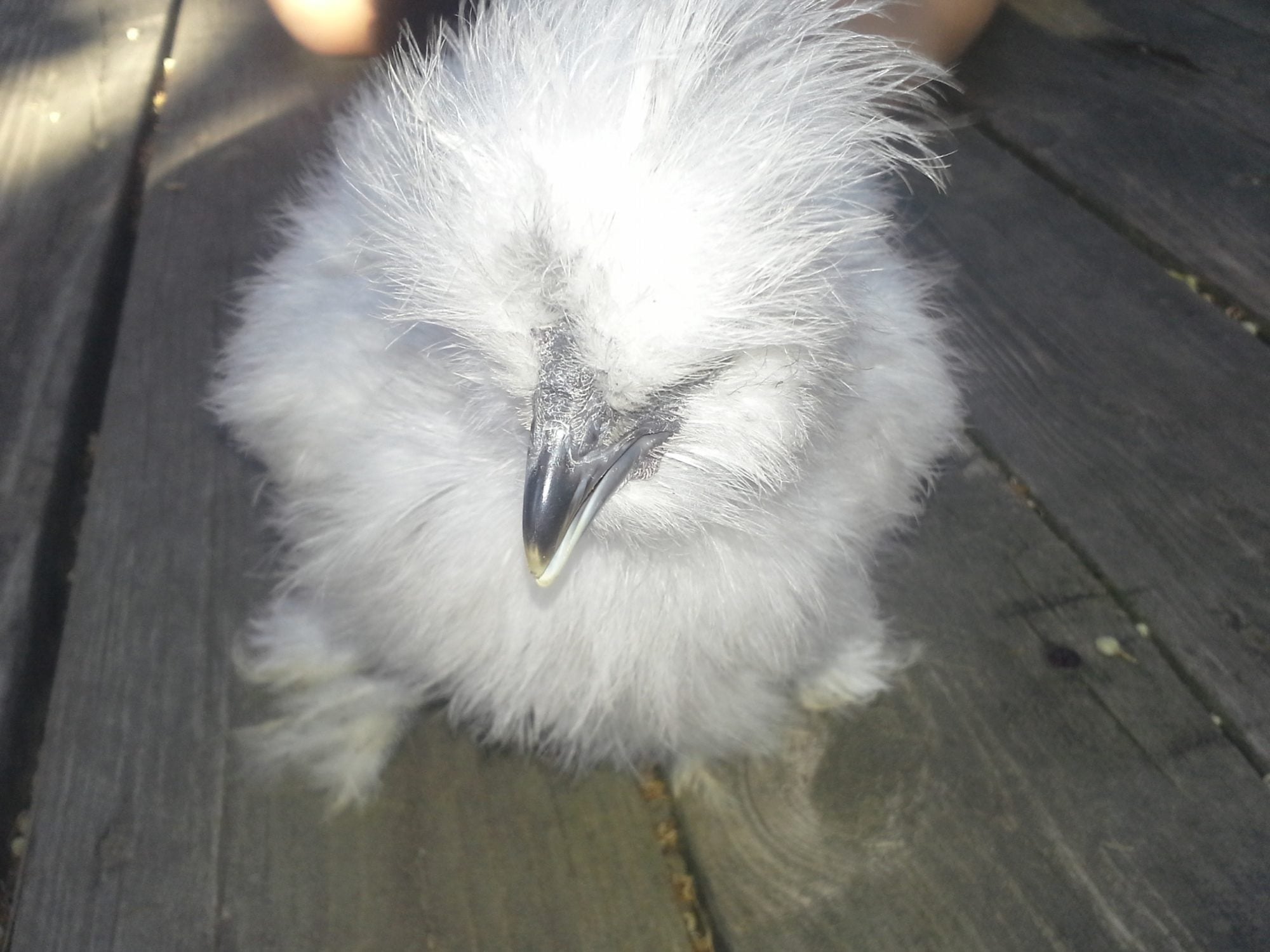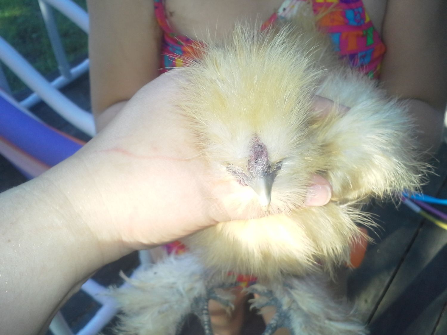 Pinto -- now I only have a few shots of Pinto because nobody wants to hold it to get comb and head shots. It has a real problem with clinging poop and I'll leave it at that. That's the reason it has no tail. As for a comb, its comb is very similar to Cottonball's -- not very big at all. Hopefully that'll help.