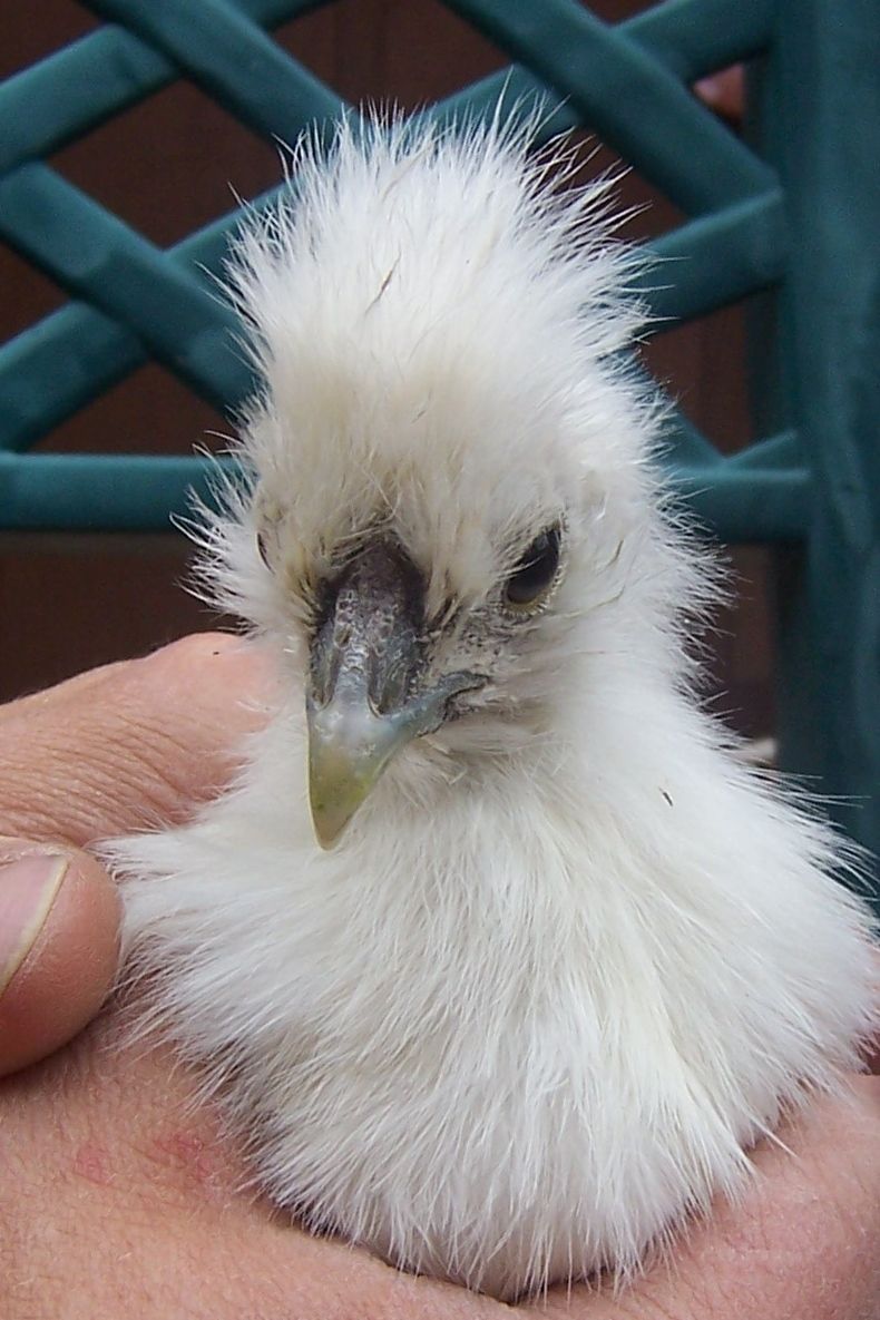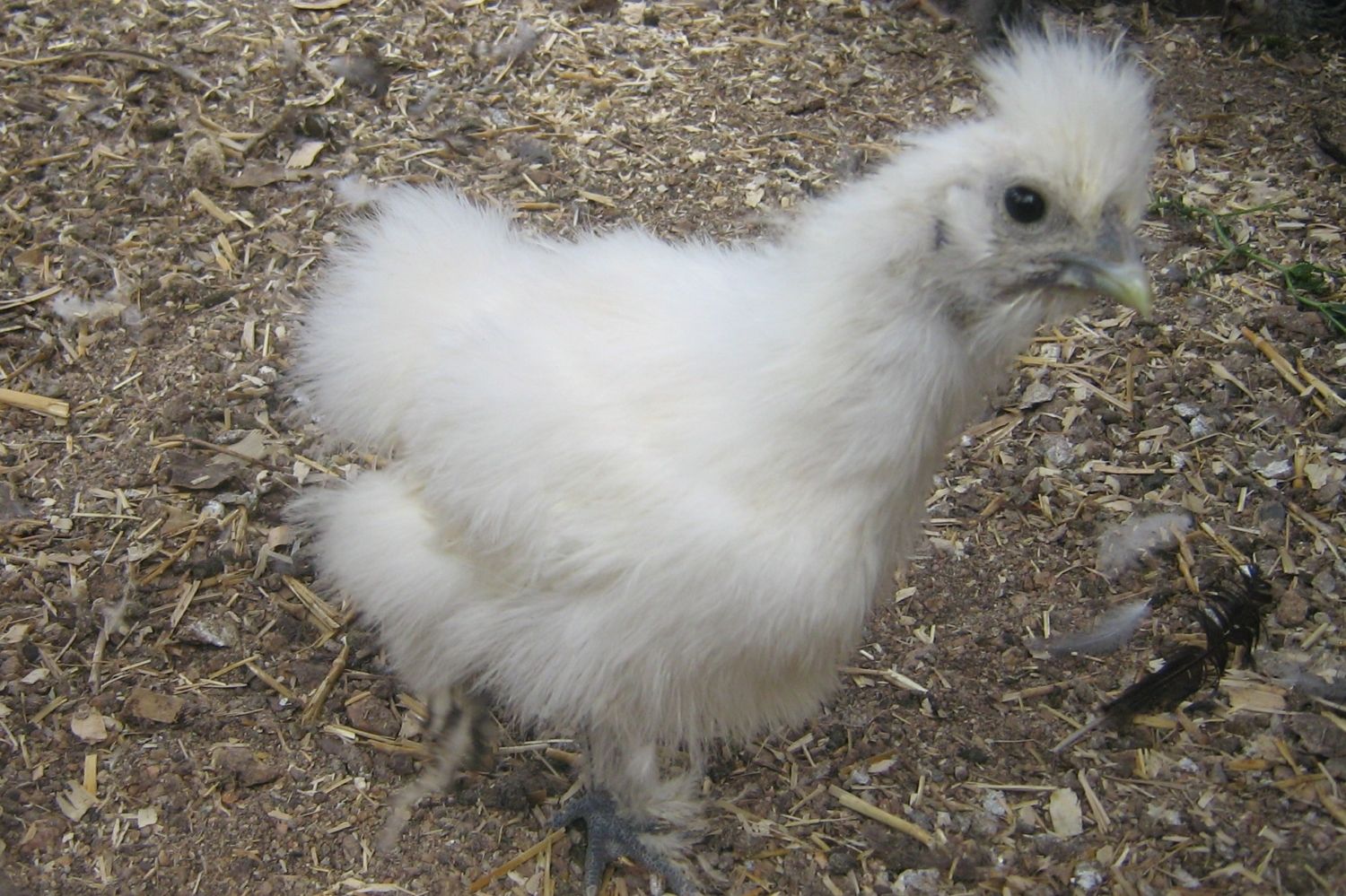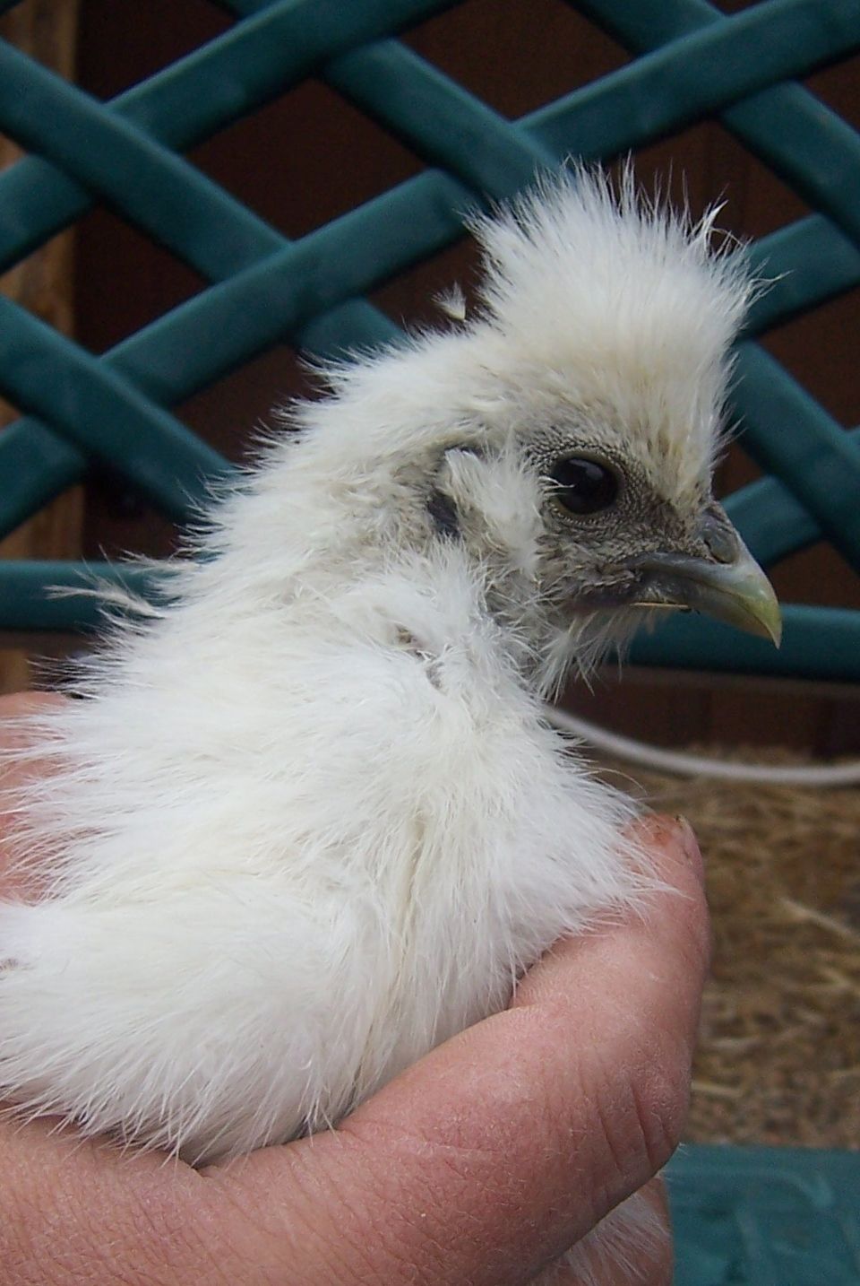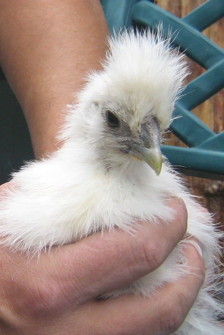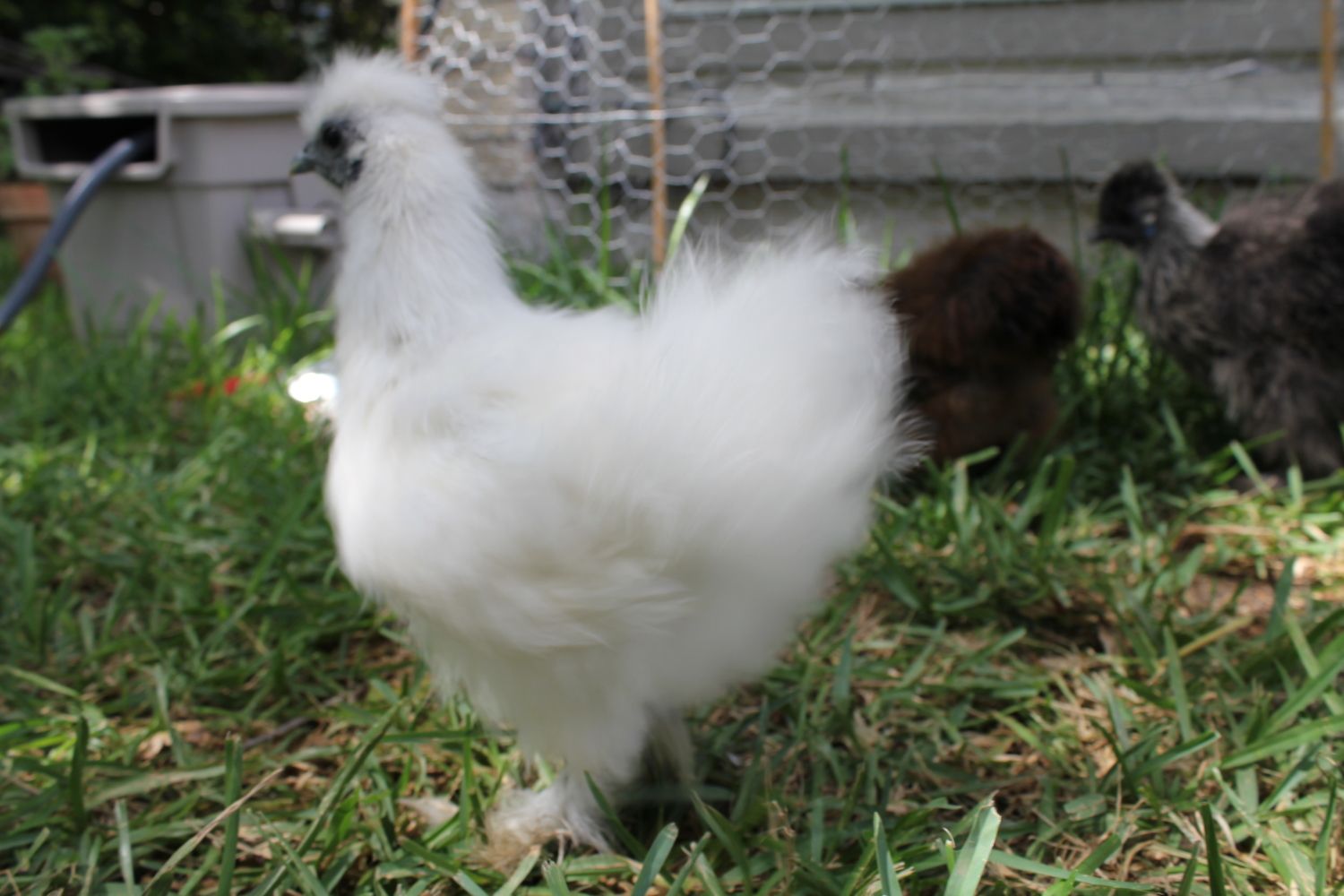 #1 White silkie named Starbuck. She is the smallest. I purchased her from the same feed store as the others, but it was 10 days later, so she might actually be a week or so younger and not from the same batch as the others. I'm on the fence about if she is a pullet or a cockerel.