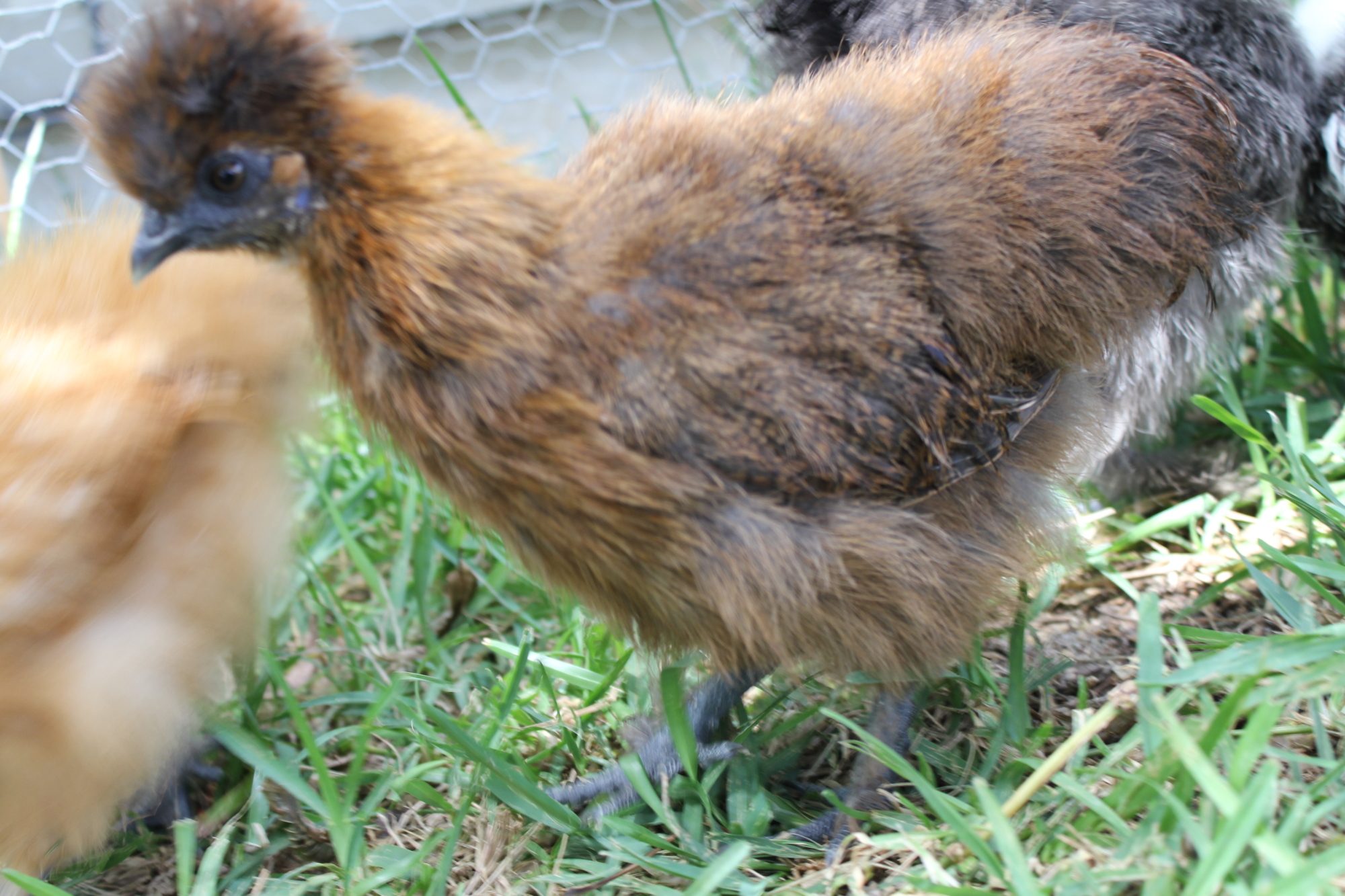 #5 Gray (?) silkie named Hazel. Possibly a cockerel. She used to be virtually identical to #4 but started getting the lighter streaks a couple weeks ago, so I'm not sure what color she is. She can be a bit aggressive by pecking at my fingers and she is always watching me closely. There is a better shot of her in the group photo below.