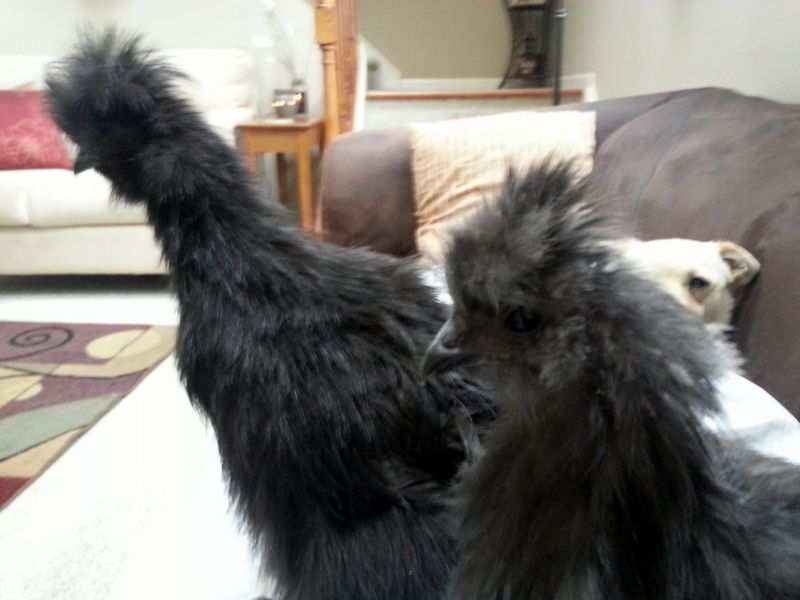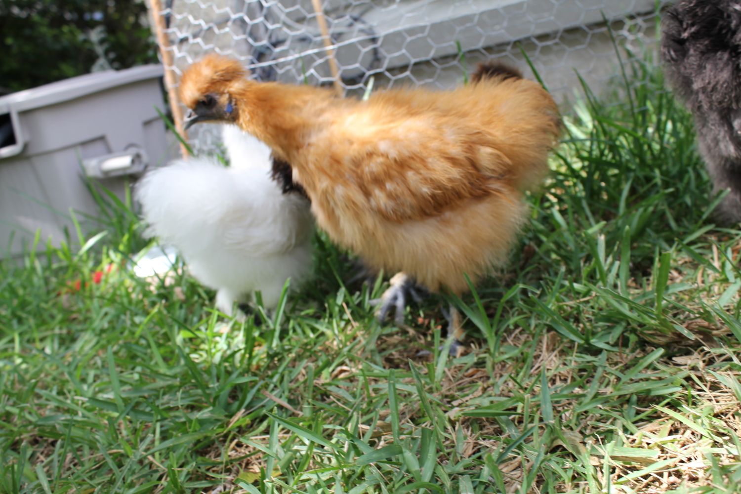 And all together now. The grays and the buff are all about the same size, with the partridge and the white a bit smaller. The buff and the white are the more social ones with me, which makes them the favorites and probably roosters, with my luck. Any help from those more experienced with silkies would be much appreciated.