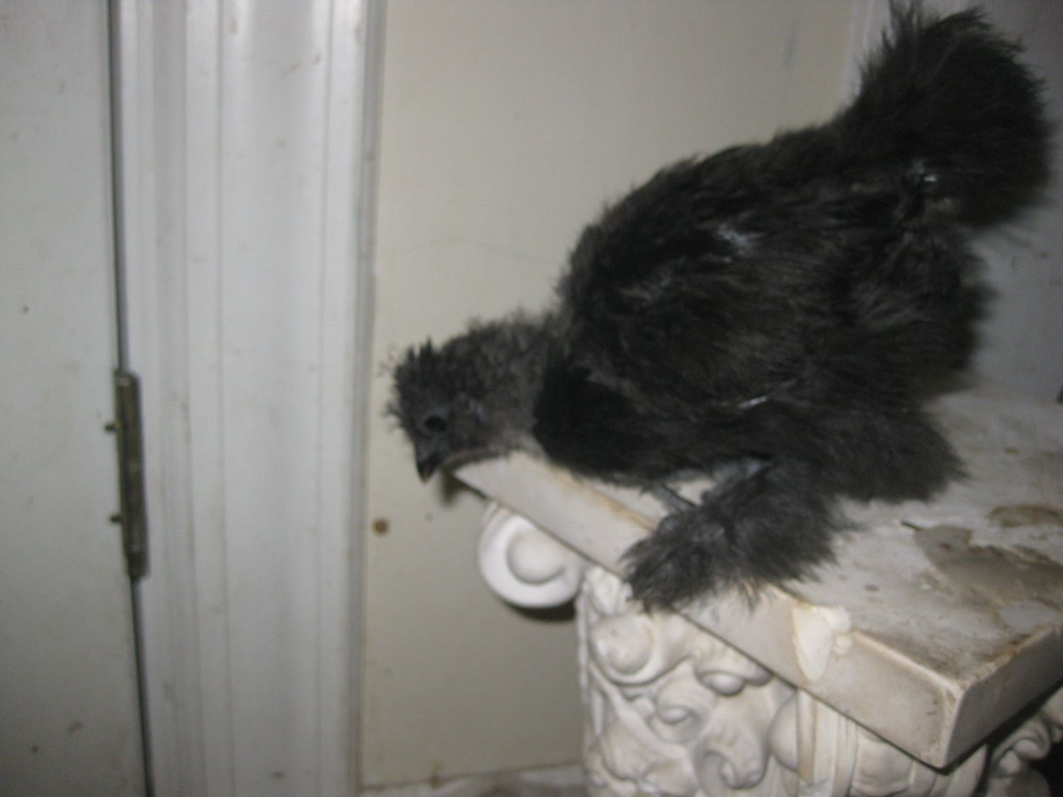 This black silkie I figured was a female as she is the smallest of the bunch and has the tiniest comb. Looks like she may be getting the full hen poof