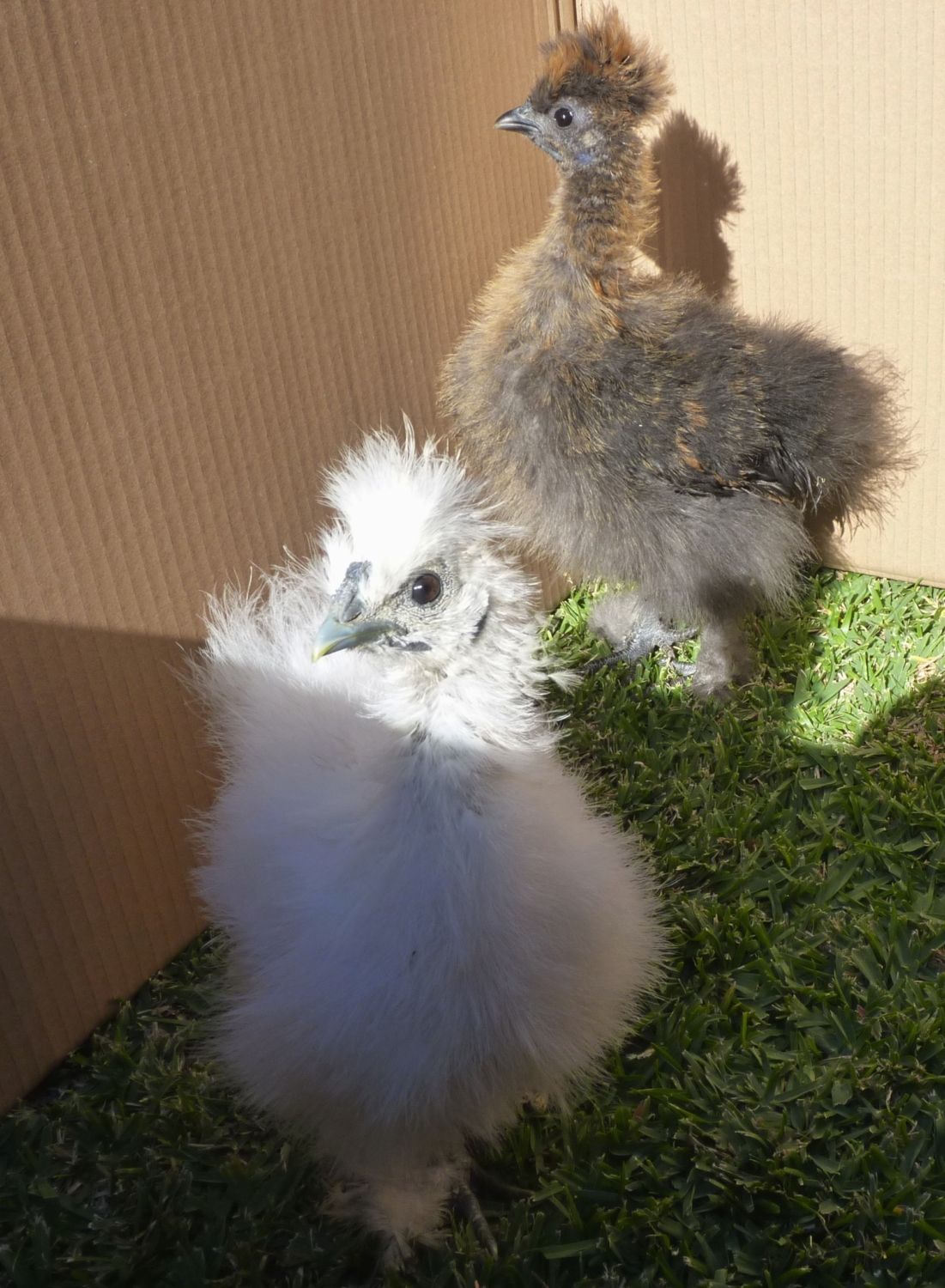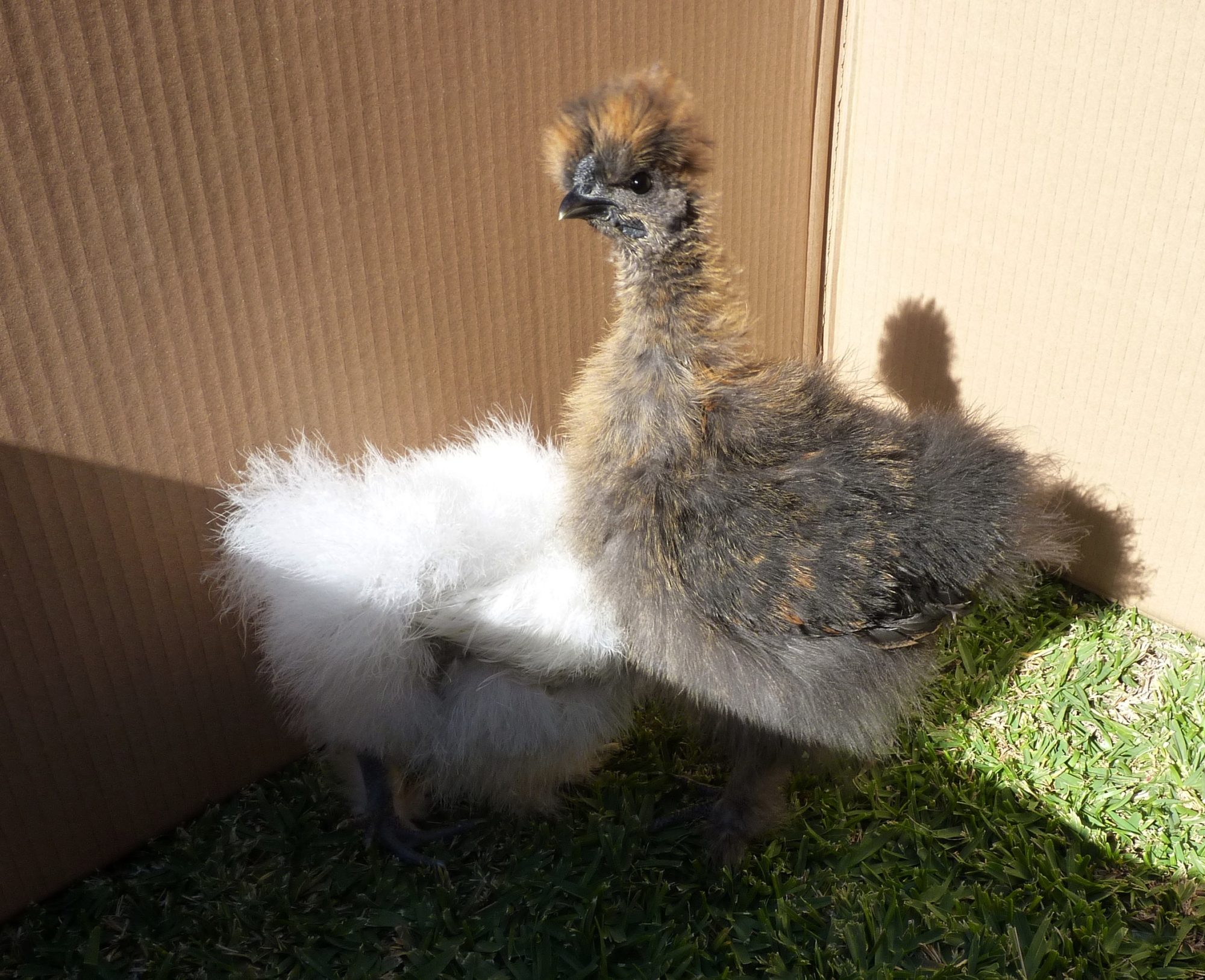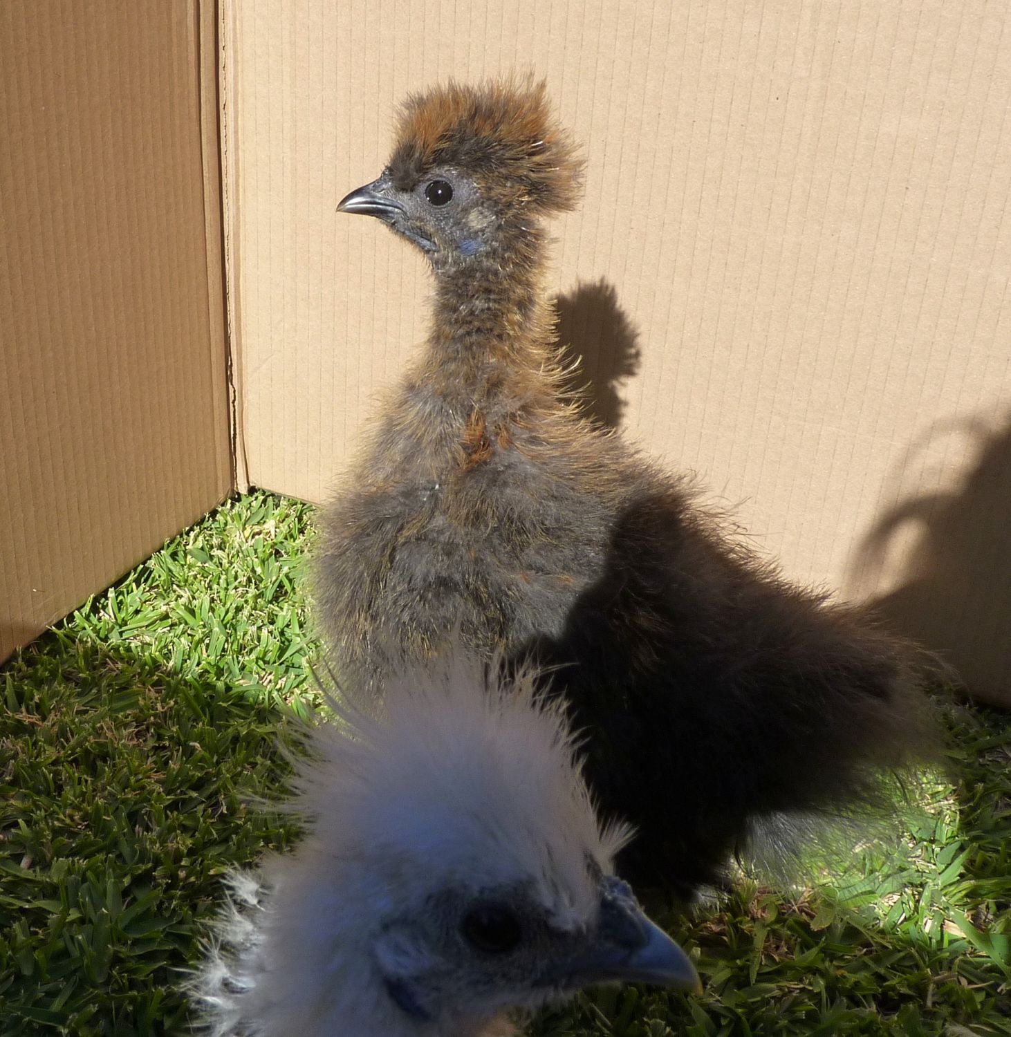 here is the weekly update of my 2 silkies. Updated guesses on gender please and also please let me know what you think about their age as I am just as unsure about this as I am about their pullet status (every night when I turn off the lights I tell them to be girls, but I don't think they really listen to me