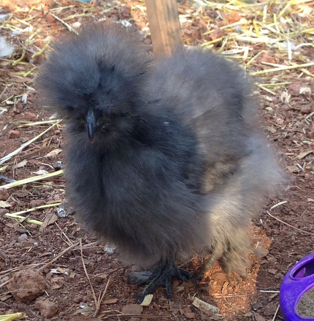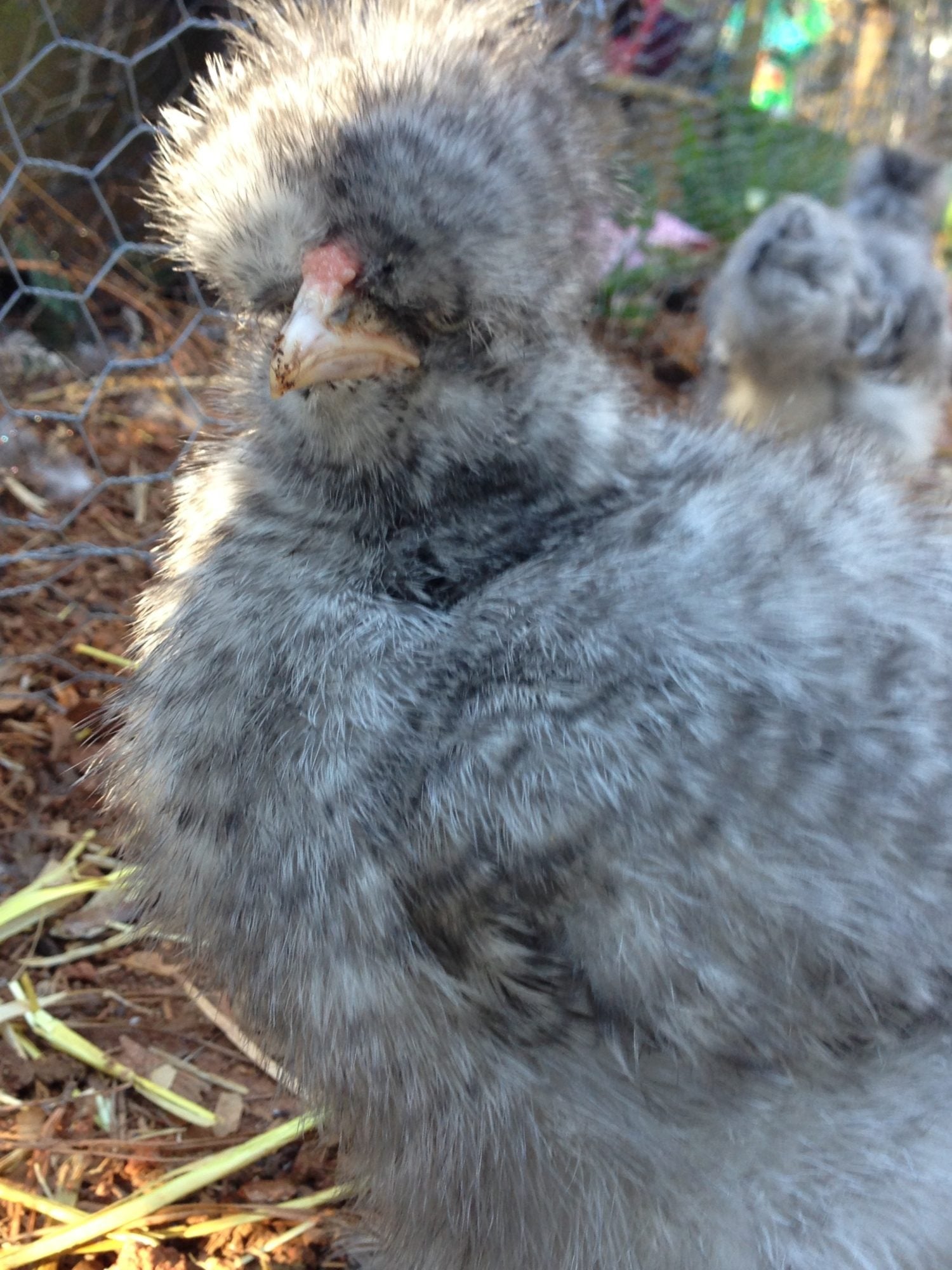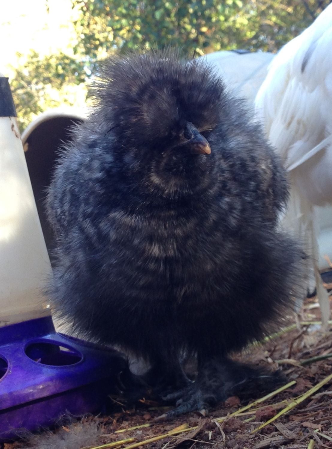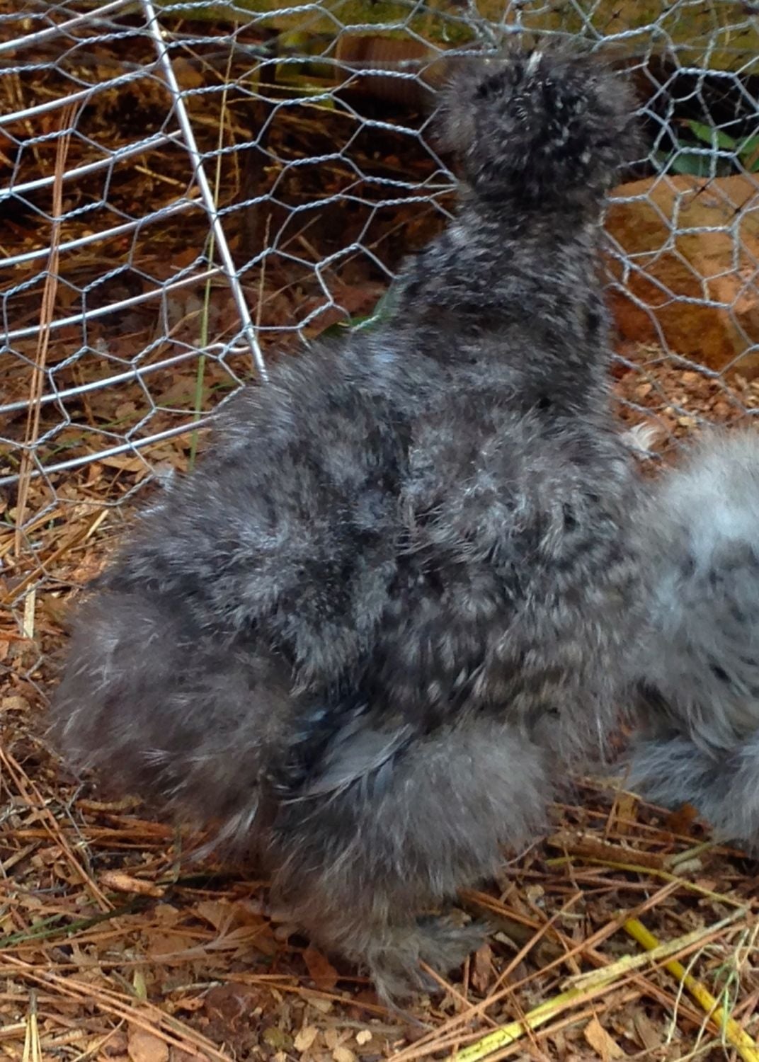 Moo (very curious and the largest of all of the Silkies hatched, so we were leaning towards a rooster, but not sure... also what color is this called? Splash? or Paint? or other?)
