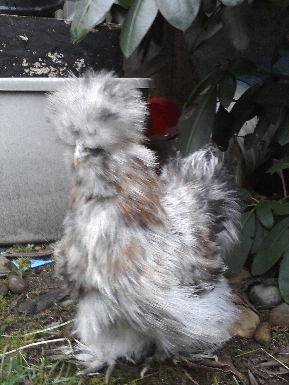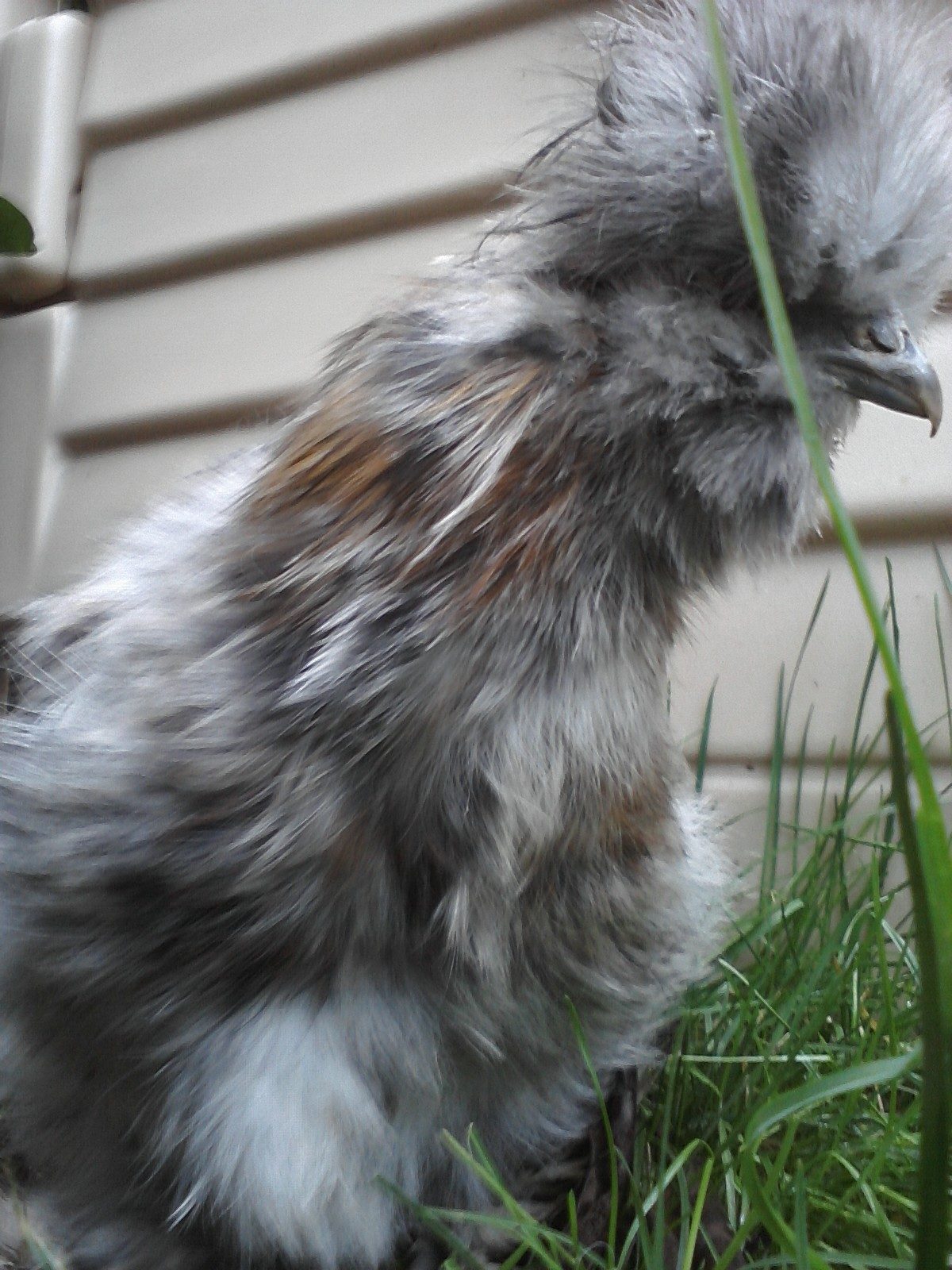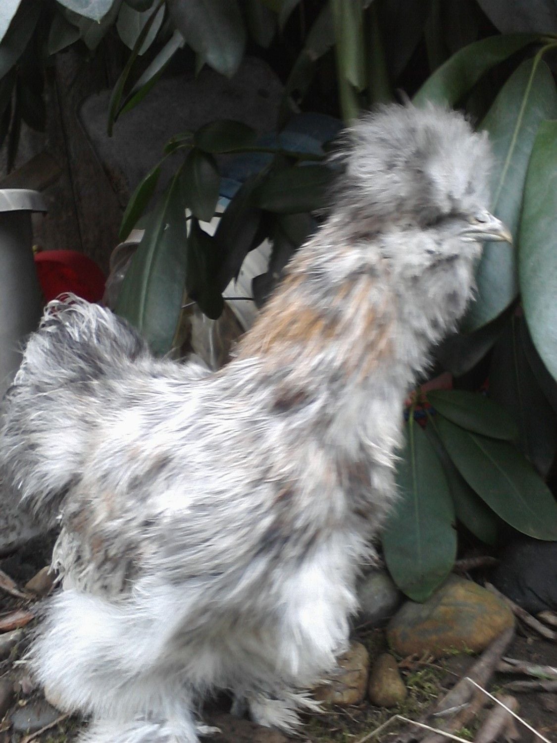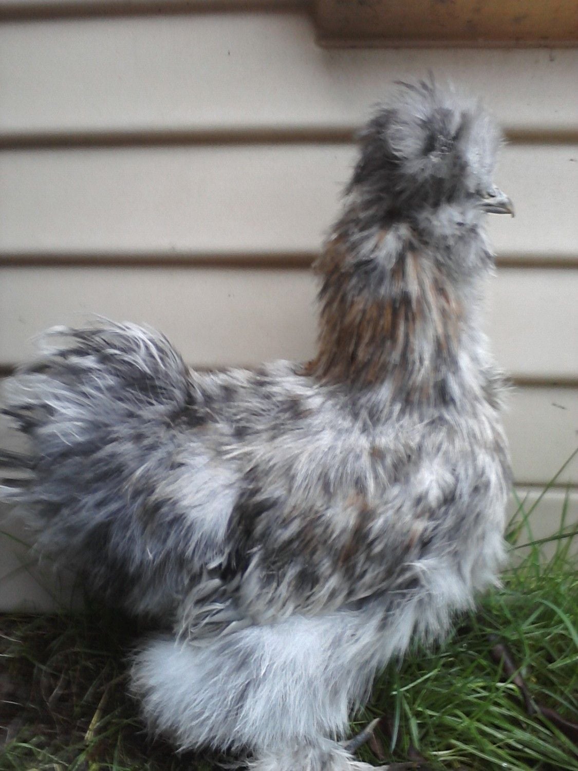 Pullet or Rooster? Calico Silkie. I see more color in the comb today. I am totally suspicious.