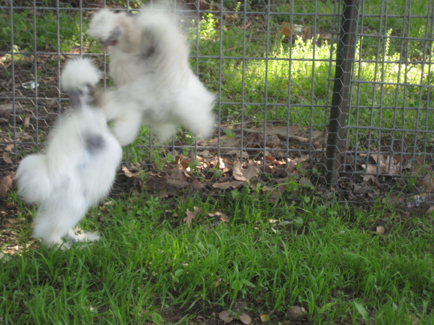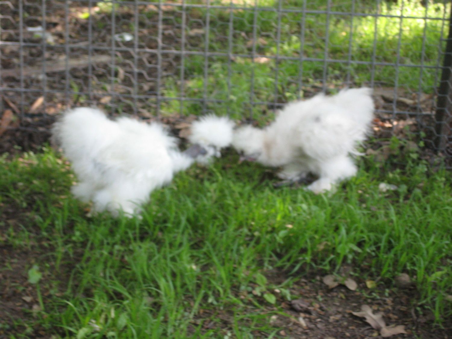 I do have more to sell. They are on e-bay right now and will end Sunday night. My father in law is building me a super nice chicken tractor. I have a big nice coop he built me last year but I want to seperate their colors so that I can breed them and know what colors I will get. I recently fell in love with the showgirl silkies. I am crazy about the one in my avatar picture. She/He? is the sweetest baby! I am really hoping it's a she. Maybe I can take some pictures and you guys can tell me what you think? The paint roo that is the same age as the showgirl has an obviously bigger comb and I know he is a roo. The showgirl has no comb hardley at all but at the top of her comb there are two little bumps that look like horns? I can't keep them with the older silkies yet because they pick on them so they are with my 3 week old babies. The little showgirl (I need to name her) fights with the roo that is the same age. I think I have pictures of them fighting. If she was a hen why would they fight unless it's just because they are the same age or something?