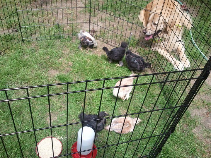 This is last years babies and our Golden Retriever Gryffin getting to know his new charges. He is VERY good with the babies and the big girls!