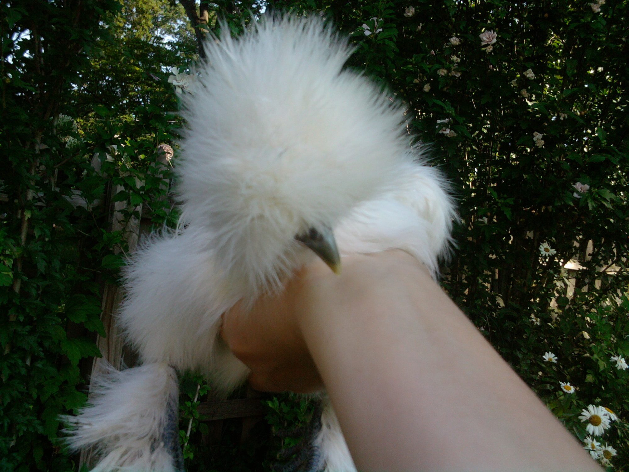 I thought this white was a boy, but I am not so sure anymore. Nevertheless, he/she is sure a fluff ball. Not so bad for a hatchery one, eh? Or does he/she look just terrible, LOL??? [I only want nice pet silkies--I don't plan to breed or show].