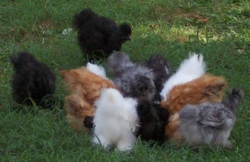 I got my silkies today!I got a dark partridge bearded silkie, a buff bearded silkie, and a black beard-less silkie! I love them! I named them Cinnamon, Sugar, and Sissy.![]()