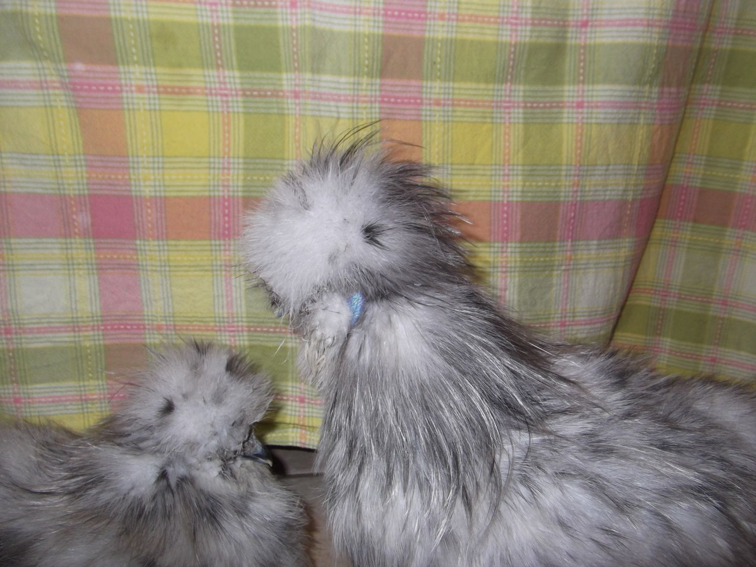 Streamers are the longer feathers that 'stream' off the head and hackle area of silkie roosters. Some roosters have a slicked-back look to their crest and most of their head feathers look like streamers. My splashes have nice round crests and then have the streamers coming in sort of from the top center down the neck area.....kind of like a crazy mohawk of contrasting dark feathers. Other silkies have different color variations. Here are some pictures of my two young cockerels (while they were in rooster prison this morning so they wouldn't alarm any neighbors.)That is FUNNY!!!and...she just layed it right there on the floor not even in a box? Well...my husband found a silkie egg outside of the coop. All the older hens lay in the coop. Two lay in the boxes up top and one lays under the hanging food container. Soooo, I wondered...Could I be wrong on the age and they be 4 months but, that is still too early. Tell me about the streamers...are they coming down from their legs, tail, what? I'm NEW at this chicken stuff. I can't believe how much there is to learn and be prepared for. Right now I'm dealing with two broody hens that I am trying to break.