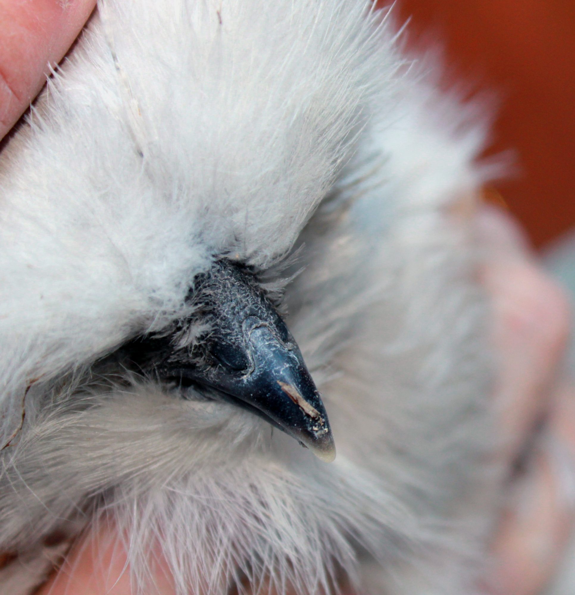 Partridge close up - And I did not notice until I was editing these photos earlier today that the tip of his beak is broken off! I have no idea how that happened. They stay in their covered silkie pen all day. I haven't noticed anything unusual happening in there. Does the tip of the beak grow back?