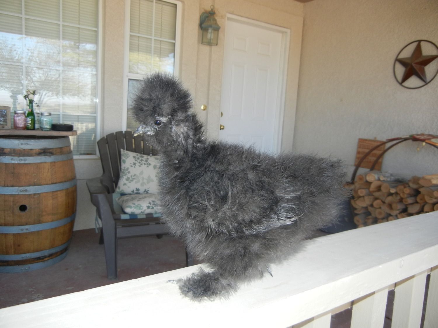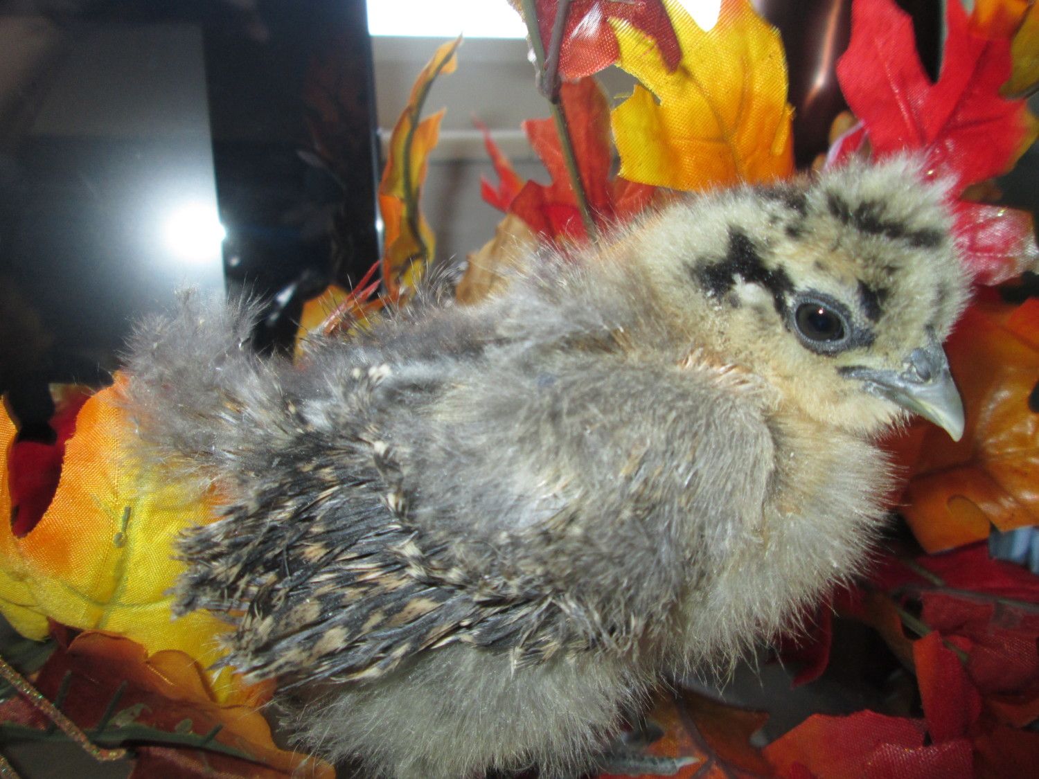 Easy to see the frizzling now!Here is my little frizzle, getting more frizzle! Saw the fall leaves, thought I would take a chance and put her on the table..it's a glass top, so if she had an accident, it would be easy to clean up, but she was good for the whole photo shoot.
