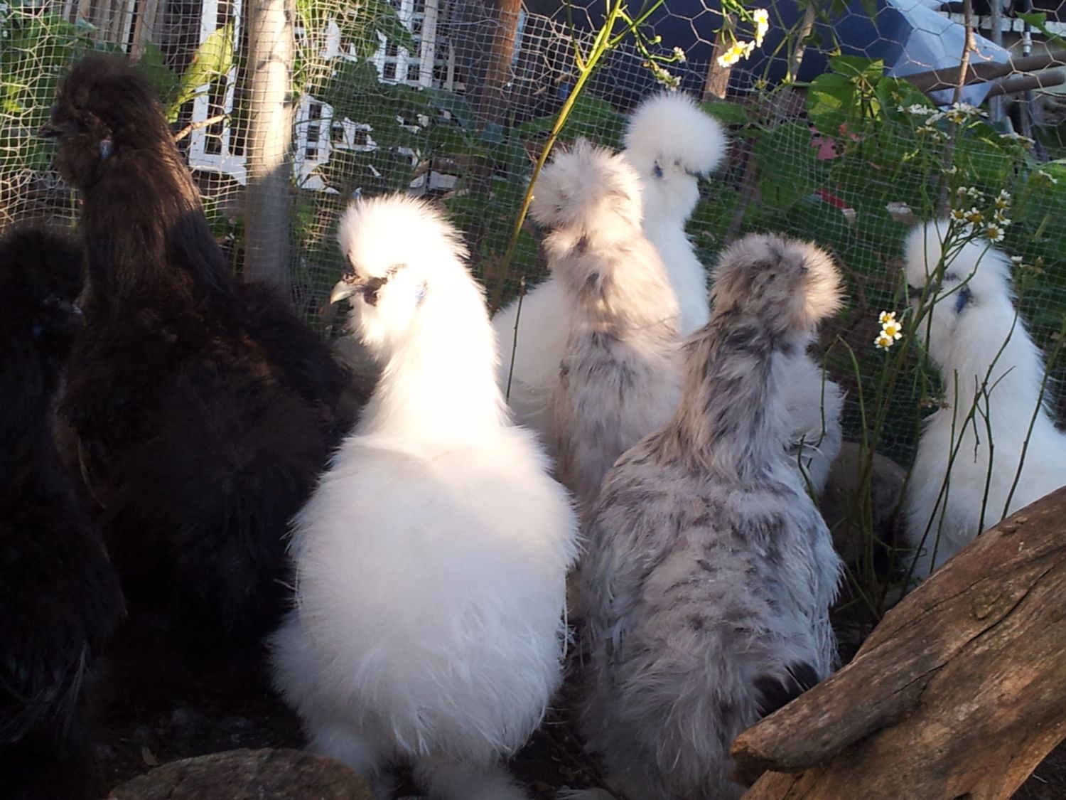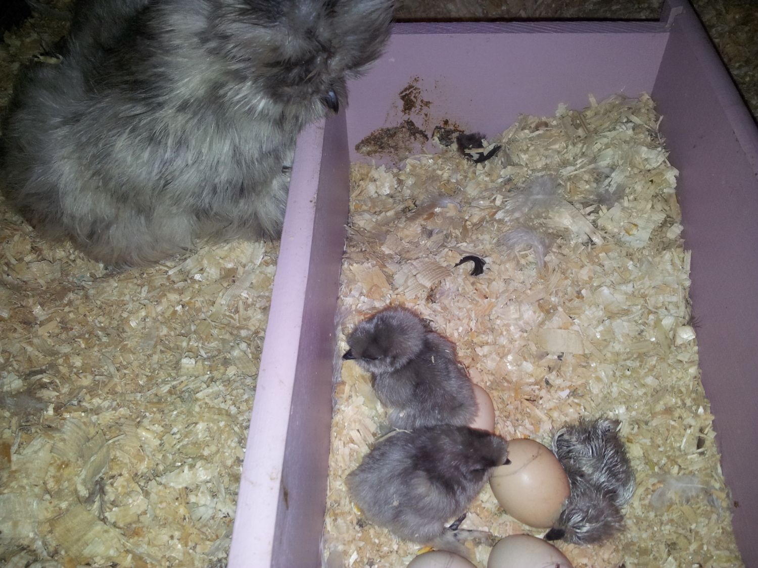 I agree with Peepblessed, it looks like you have, blue, black and splash. Really cute!!!!I love these silkies. I finally got some this past spring. I hade to drive 9 hours but it was worth it. Here are a few pics. I realy don't know anything about silkies but i have been loooking for two years. They are the most gentle chickens i've ever had. The only problem i am having is colour. I have two splash, two black, and three white. I have two roos, one black and one white. When eggs started hatching i was very surprised. (not that eggs were hatching) lol. The colours of some of the chicks is hard to figure out. I have included pics (if i did it right that is). One pic i had to add because everytime this chick would sleep he lays with his legs spread. The first couple of times i checked on the incu babys i thought this chick had passed. Anyway here they are, can anyone tell me if some of these chicks are blue? Thanks Angie.