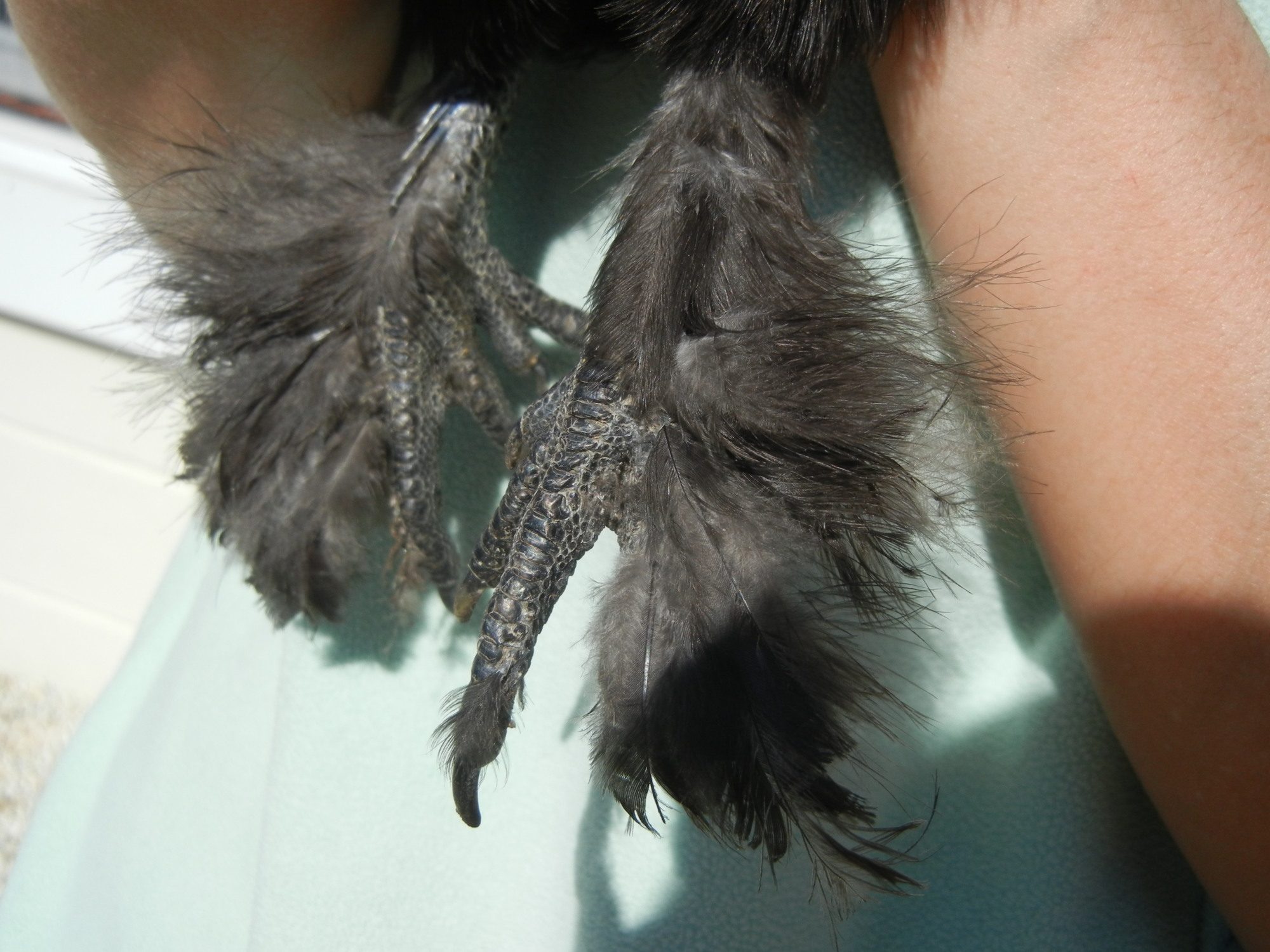 Her feet (I'm no expert, but I'm pretty sure they lack feathering)