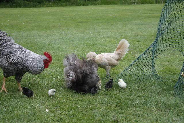 Here she is, harassing a broody silkie and her bitties. I have no idea where that silkie's head is, or even which silkie hen it is of mine. Either Lorraine or Pearl.