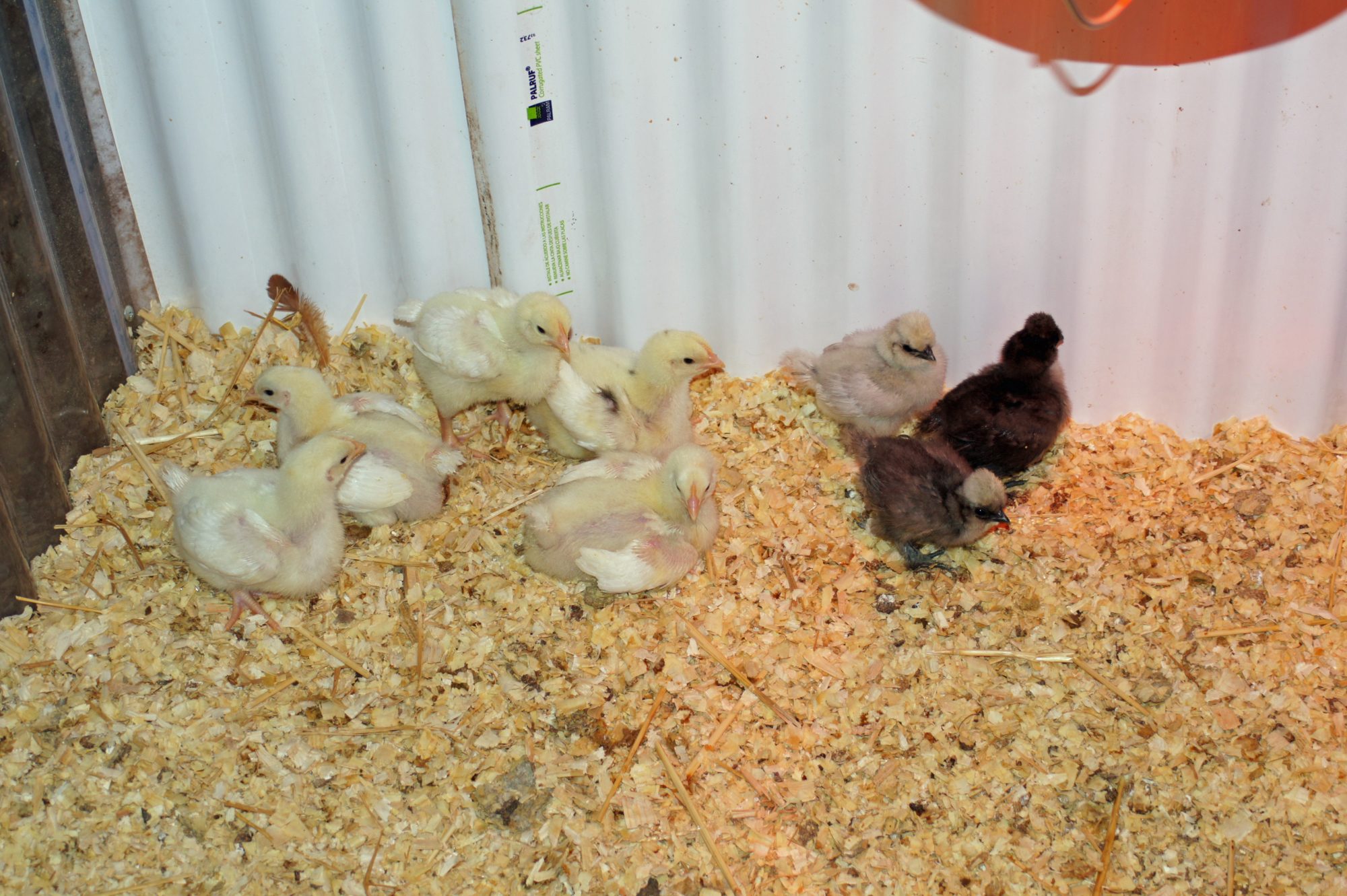 Silkies and the "meat group". The Silkies are a week older than the meaties and half the size.