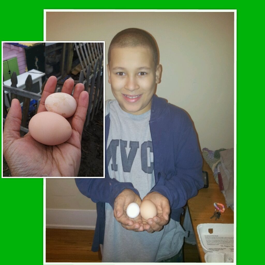 The picture on top is from today ad the picture on with my son is from a few weeks ago. The large eggs are from my barred rock and are there to show the size and color difference. The lighter egg is from my partridge silkie Apri now I'm guessing that the hen lays the same colored egg? Which would mean that the egg I found today could be from my other white silkie Bernadette?