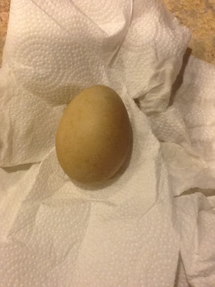 My little Lucy Finally layed her first egg! I am surprised how brown it is and big! It was out in the dirt I rinsed and wiped it off best I could but you can still see its pretty brown.