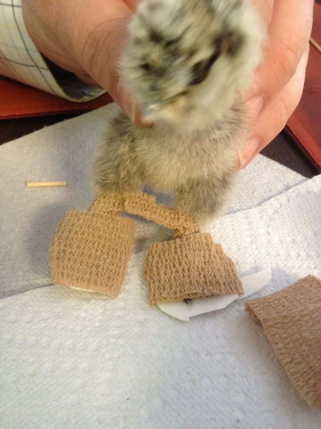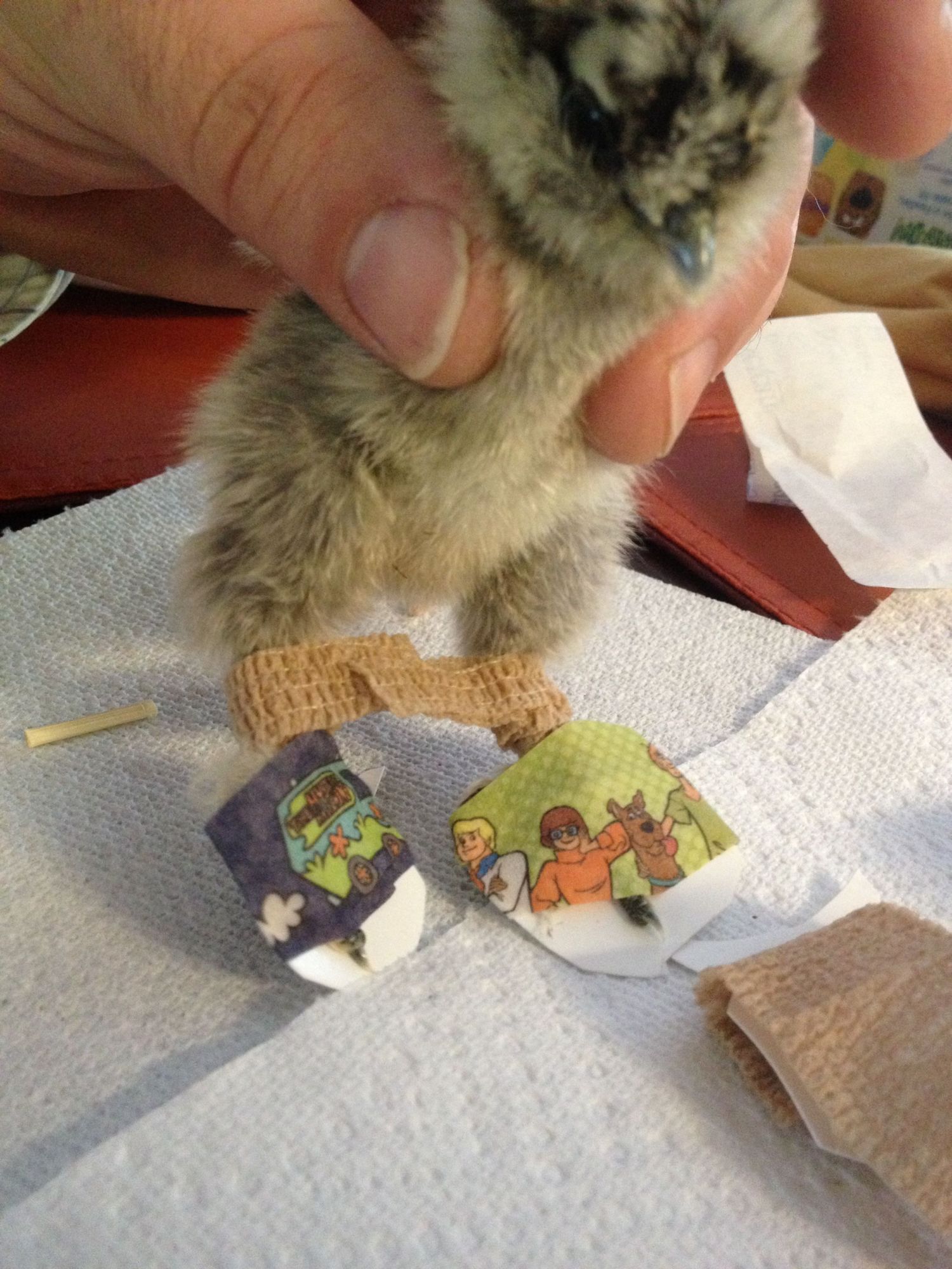 If she doesn't have splay leg just curled toes she doesn't need the brace between the legs, that's for chicks that are doing the splits can't walk or stand. The cloth bandaids will probably work better for the toes. Please keep us updated on her progress, she is so cute.
