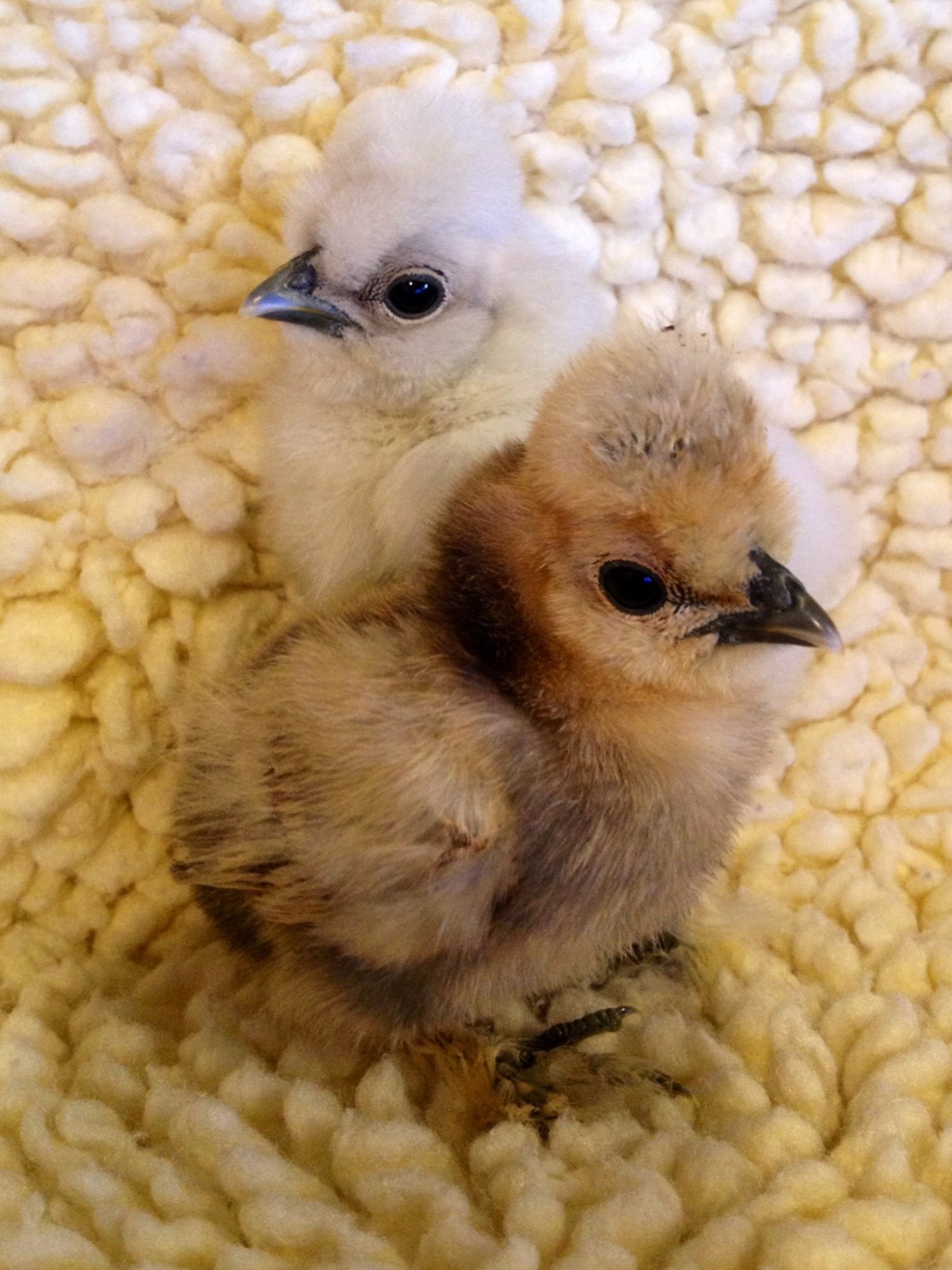 Chicken genetics are crazy! Mom is my beautiful Calico Silkie and dad was a buff. I got two Snow White, 2 brown, and one Jett Black (hatched today). Two of them have them have the prettiest vaulted skulls
