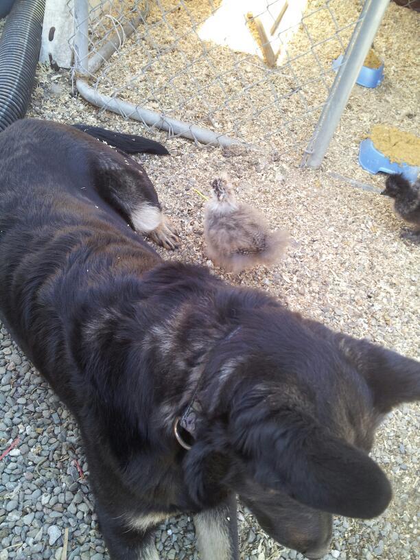 My German Shepherd named Birdi has her own little chick, whether she likes it or not ;) This chick is so fascinated by Birdi. For the last 3 weeks or so she has been following her around and frequently walking up to inspect her. At first Birdi was a little freaked or by it. Now she ignores it. :) The chick's name is Birdi's Birdie.