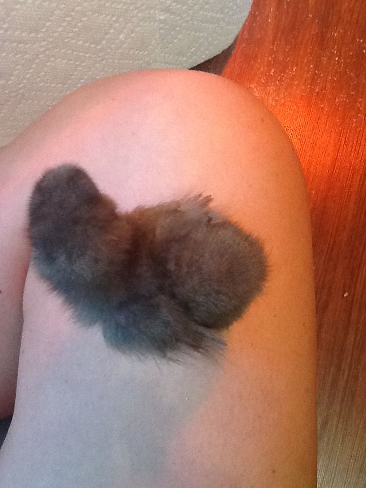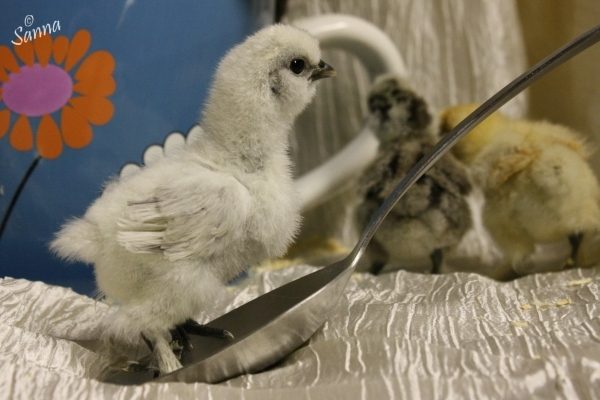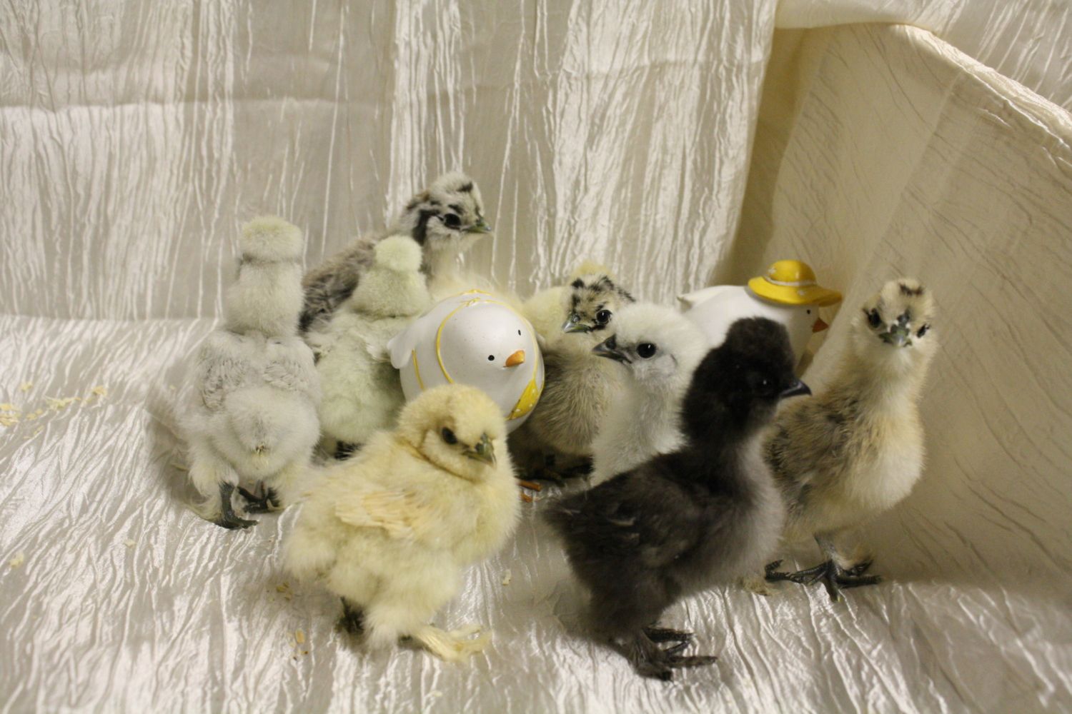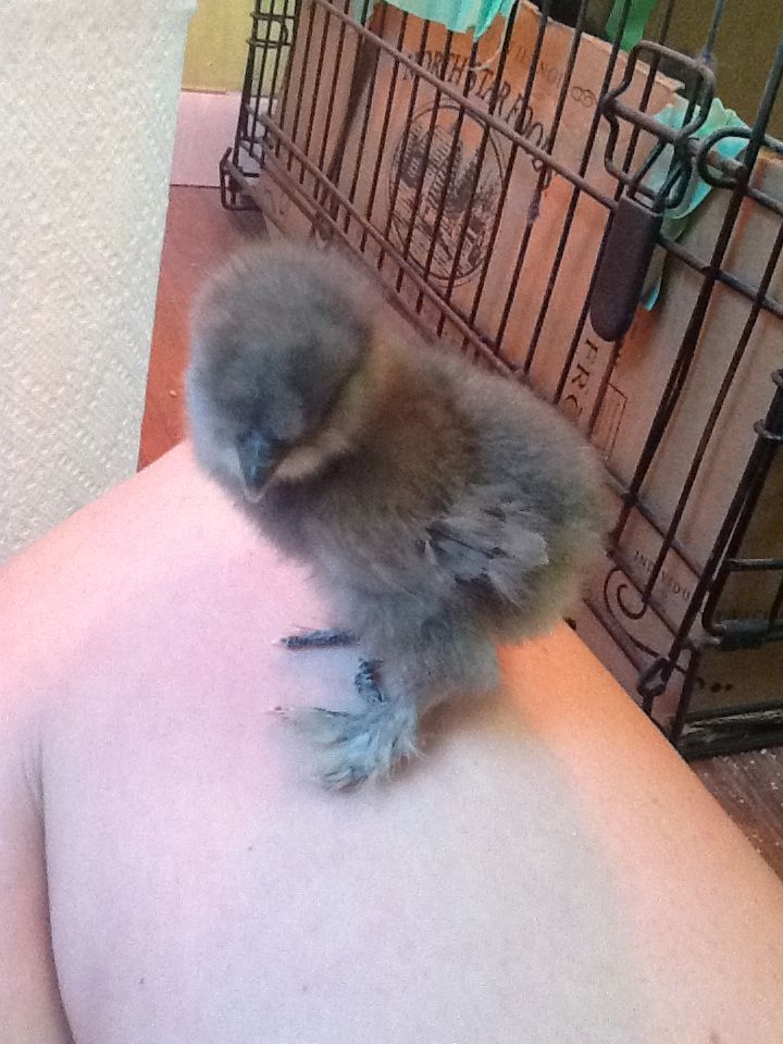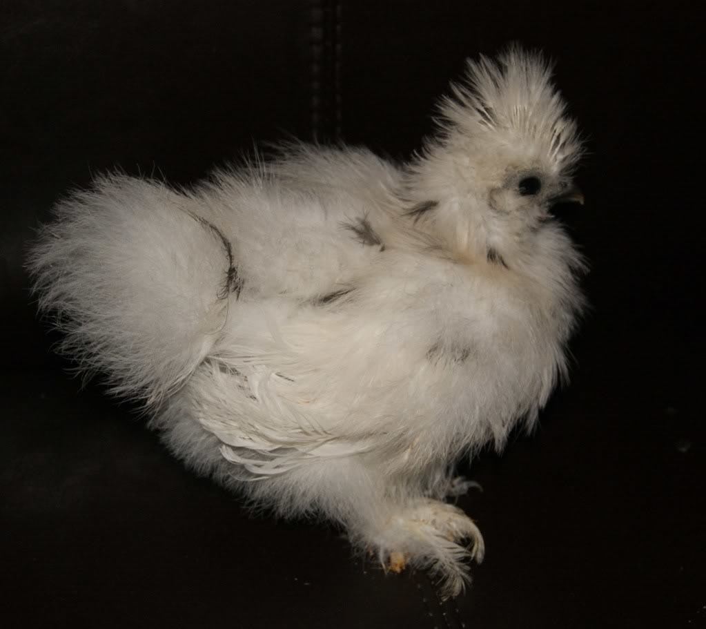 This chick here is a splash. It looks pretty white. I guess you could call them very, very light gray. You can also see here what a Silkies wings should look like. If the chick you're talking about with feathers that are starting to turn, as in curl out, I bet it'll be a sizzle. A pure Silkie does not have feathers that turn/curl.