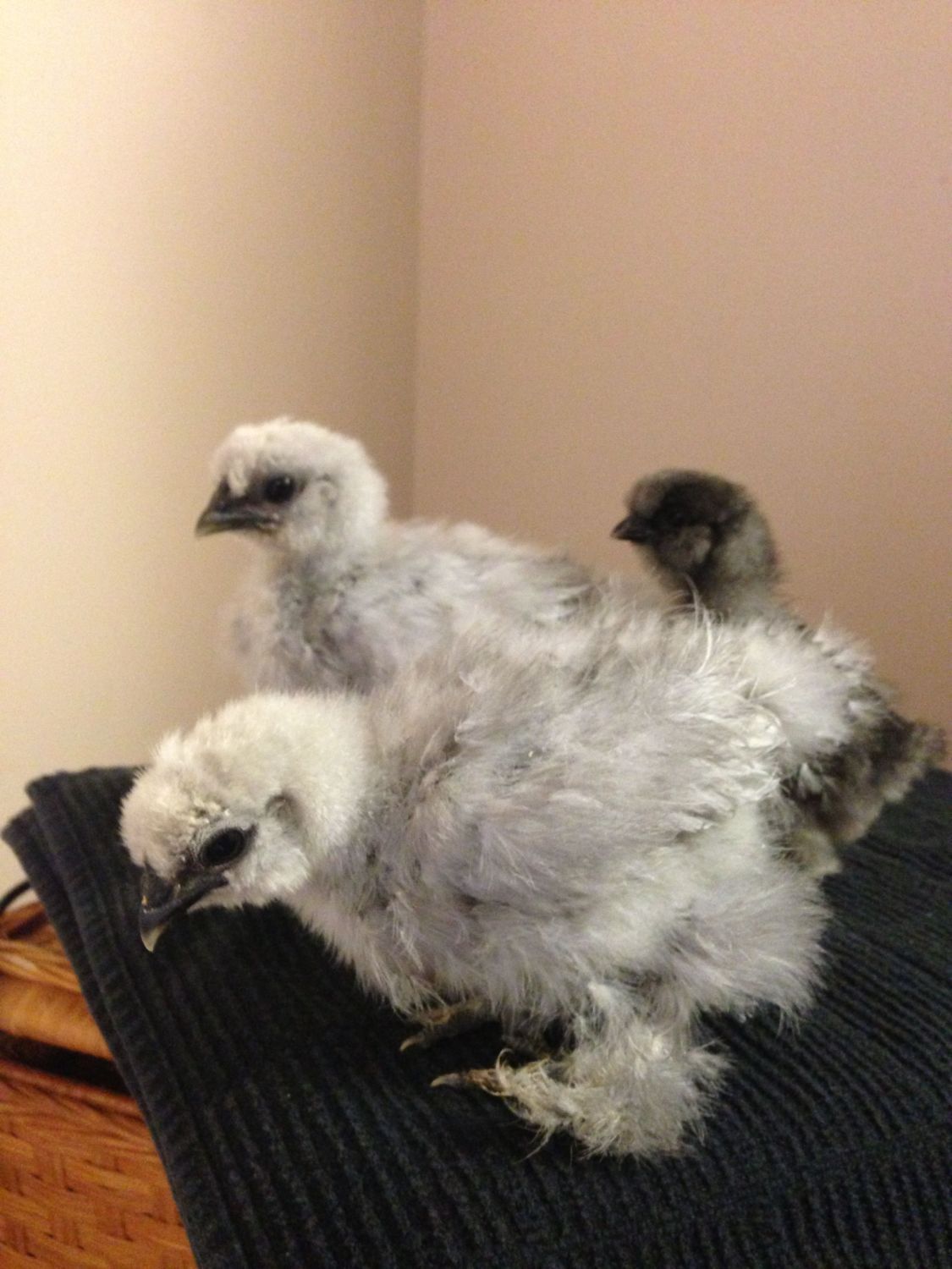 I had 5 silkies hatch out recently from a lavender split roo x black hen and the same roo x splash hen. (Only one egg was from the black hen and ended up being a partridge chick) I sold the two partridge chicks that hatched and kept the blues. However I'm wondering if all three are true blues or if one is a splash? I have a dark blue, a lighter blue and then one that looks blue but has some yellow feathering as well. Are they all just different shades of blue? Here are some pics....
