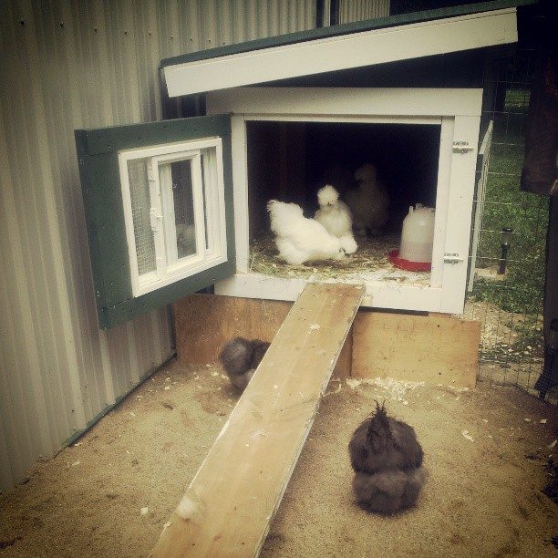 Nice coop.Finished the Silkie coop yesterday. They are investigating the ramp and a couple have used it. It's a very low incline, so I think they will do just fine. I was also wondering if any of you would know why one of my hens would lay three eggs the first couple of days we got her, but hasn't layed anything in the couple of weeks since. Apparently she layed every day-ish at her old home. She isn't egg bound, or broody. Could it be just normal spastic silkie laying?