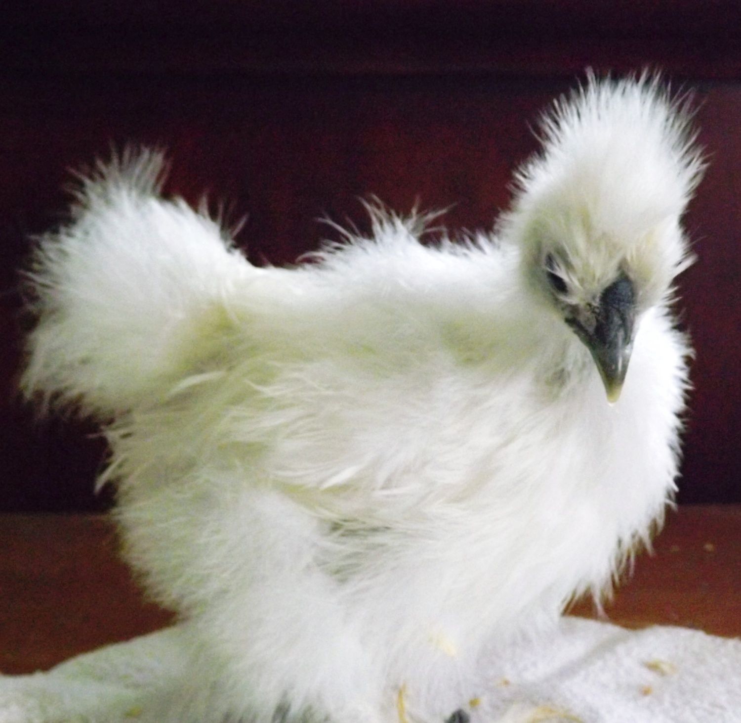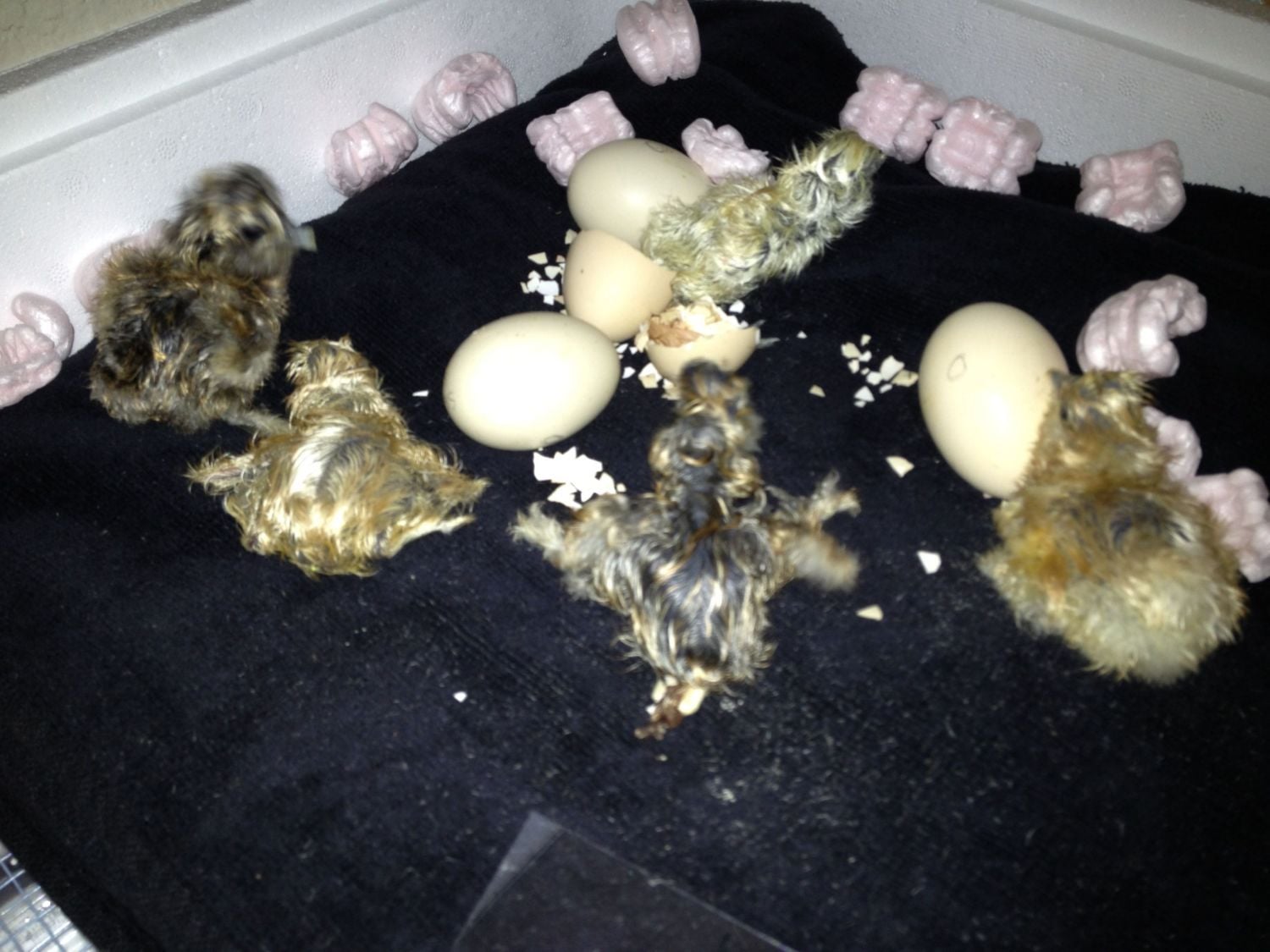 I don't know about #1 but #2 definitely looks Porcelain to me. My two Porcelain boys look very different from each other. One has more blue tones with darker points. The other is more creamy blue with buff points. Karen's Porcelains are stunning. I need to go pick up more eggs. I'd like to get some girls for these boys.So chicks #1 and 2 could be Porcelain?? That would be my favorite!!
