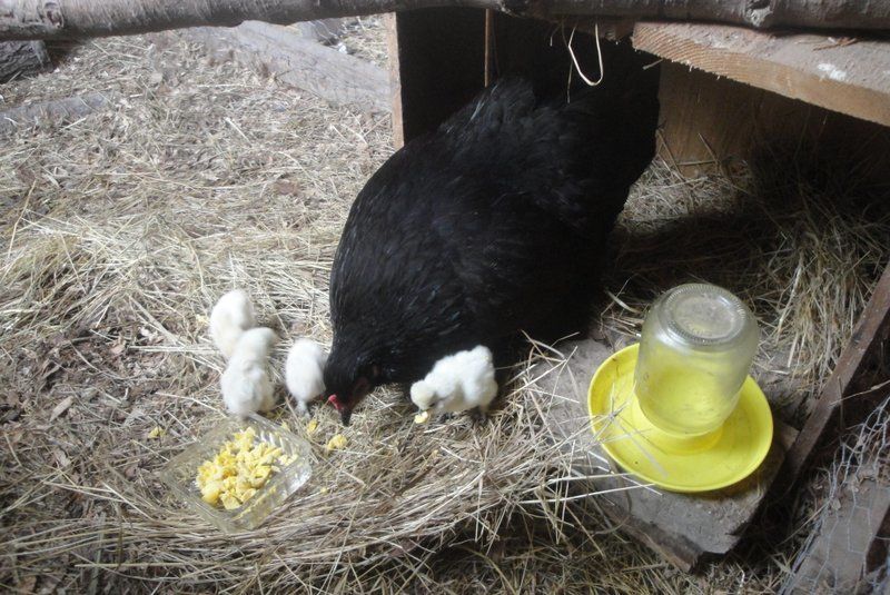 Judy The Broody called her four chicks out of the nest to feed them scrambled egg this morning.