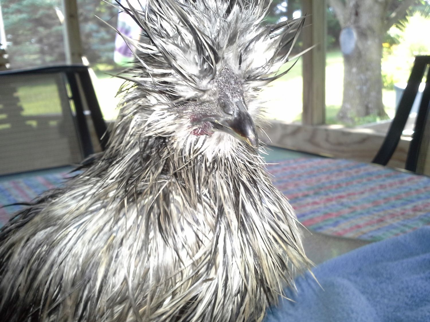 Four months old. We call it "she" because it's a rather feminine-looking chicken when not wet. The comb and wattles are a new development.