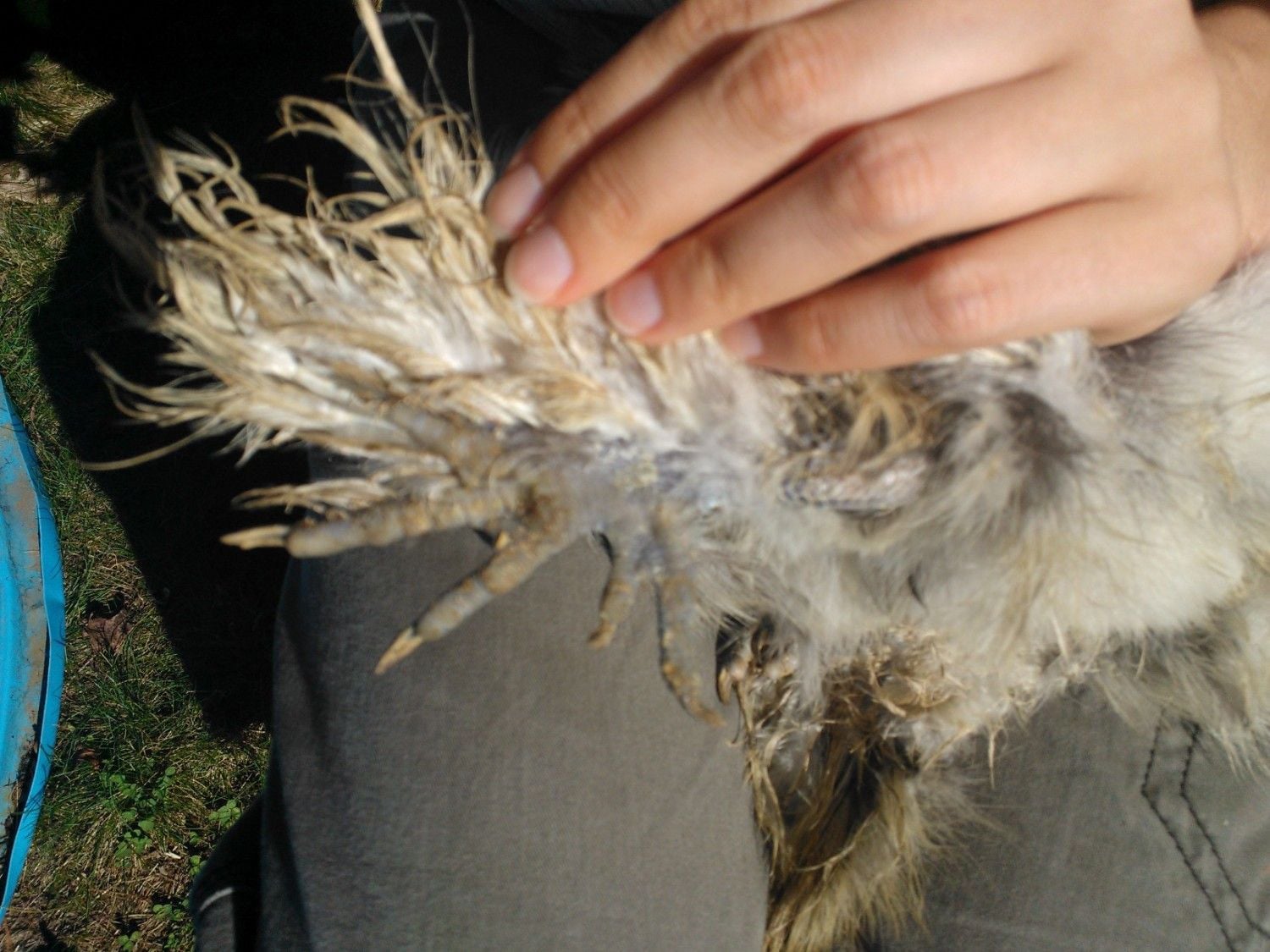 Poor girl. I hate rabbit cages. I never pit my chickens on wire. Clean the girl up a bit lol.. Maybe not put her in rabbit cage. It could be the problem.