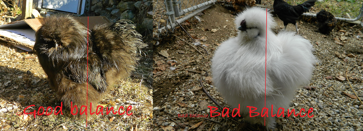 There are good (and bad) qualities in both of them. A "perfect" Silkies "type" should be even in the front and back ends (drawing a line down the middle they should have equal amounts of bird on both sides), and have a nice short back so that their head and tail come in towards each other but not so much that they look like they are going to tip over.