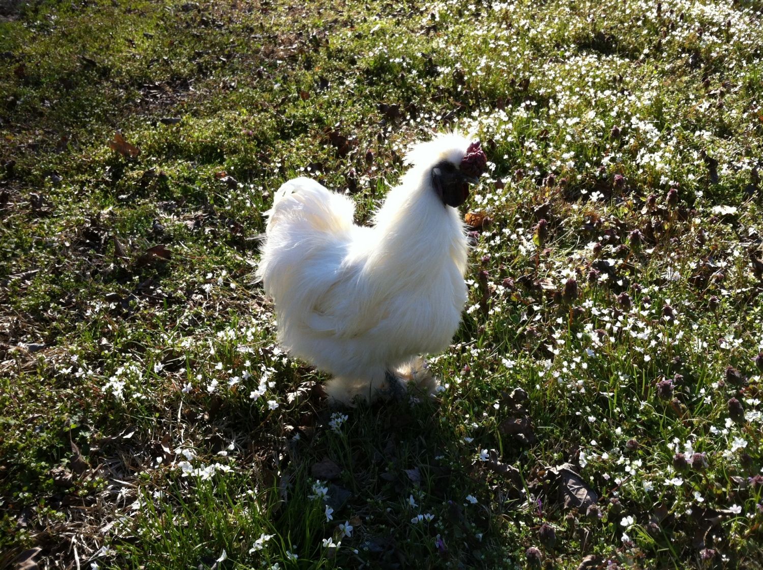 That's a handsome fellar there! Never seen a silkie with white earlobes though! Thats funny about him running ppl and unwanted critters out of your garden. Our large Moran rooster isn't mean, but due to his size and him wanting to come out to greet ppl. People are afraid of him! LOL I call him my Wa Wa Wa boy. He's always singing Wa Wa Wa to me! Theres times I have him and our large dog following me around the yard. I tell my husband - me and the boys are going for a walk!
