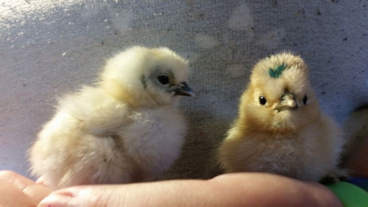 I just noticed today something about the new babies. Two of the buff's look like they have a cotton ball on the tops of their head but the white and other buff do not. I would guess that it is a breed thing, or is it an age thing? They all had their egg tooth when we got them on Friday (4 days ago). You can kinda of tell in the pictures. It's hard to get pictures of them at this age because they are speedy racer lol