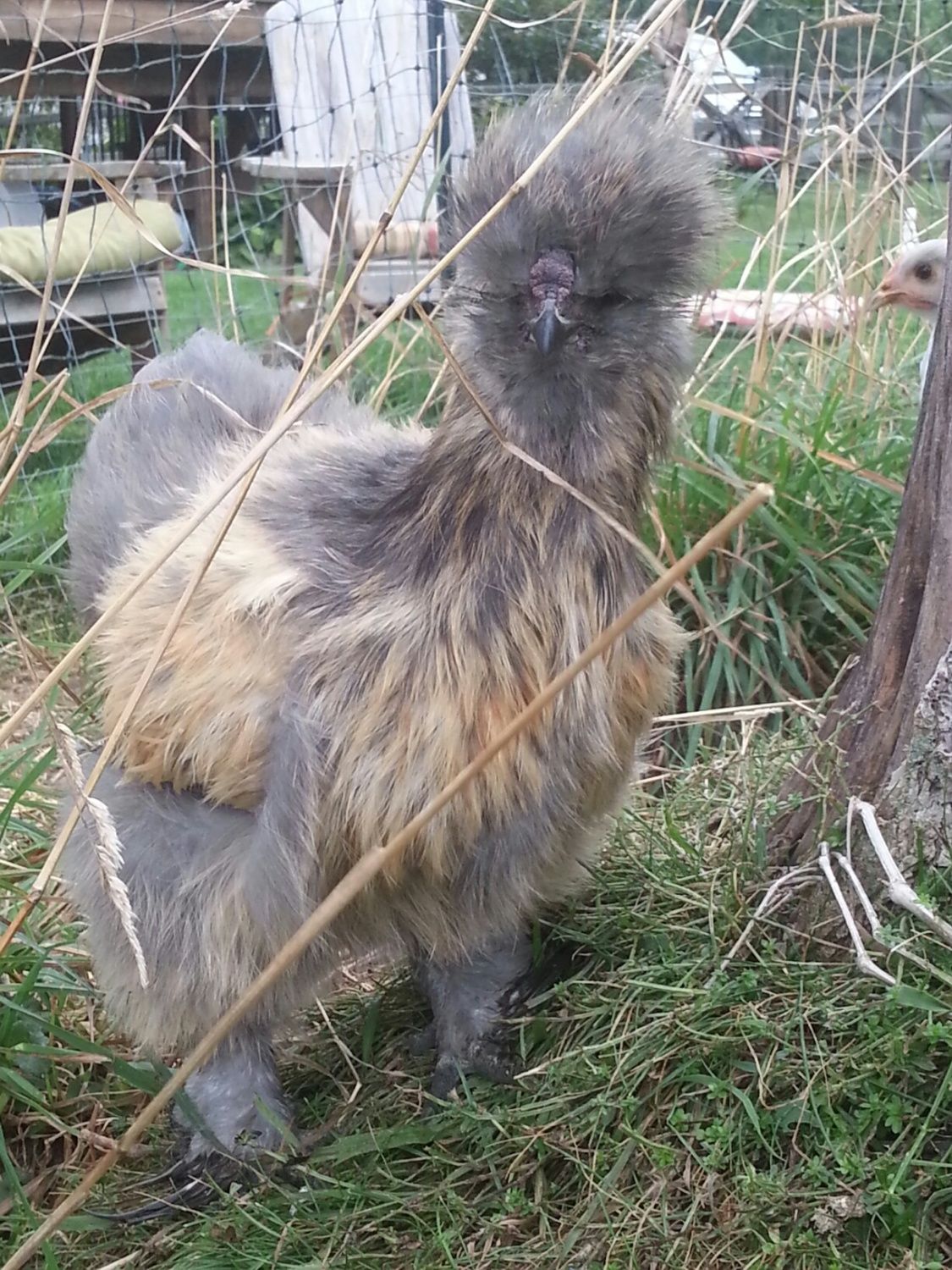 Well my white silkie hen Dolly got a new indoor home. Her depth perception still isn't right and her pupils are still dilated and unresponsive. I think she is mostly blind. I think it has to be a head injury. Her balance is fine and she lays her egg everyday. She eats and drinks once she figures out the depth of the dishes. She tends to put her whole head in the water dish getting a drink though. She stretches her neck up a lot and seems to be trying to see. She also has a curled foot from birth, so she gets around slow anyway. Today I noticed her eyes are squinty. I have no Idea whats going on other than head trauma. Shes been this way for a month now. She also is having a little molt. She has her friend Ashes in with her for now. Ashes got a little over loved by the boys, so shes in side getting her feathers back.