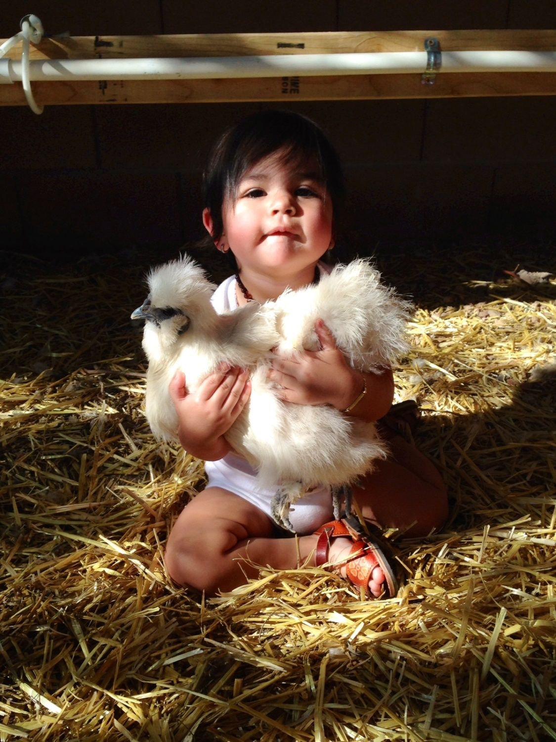 It's difficult with toddlers to learn the proper hold since their arms are so small. In your photo the toddler is holding the backsides of her Silkie. If the Silkie spooks the natural surprise reaction for adults/children are to tighten their hold on the chicken and if the hold is on the hen's sides can create an issue in the reproductive area. Your daughter obviously loves her little Silkie so a lesson in how to hold a hen safely can be practiced and reinforced. After some reinforced lessons your daughter will probably start instructing others if they don't hold "her" Silkie the right way!